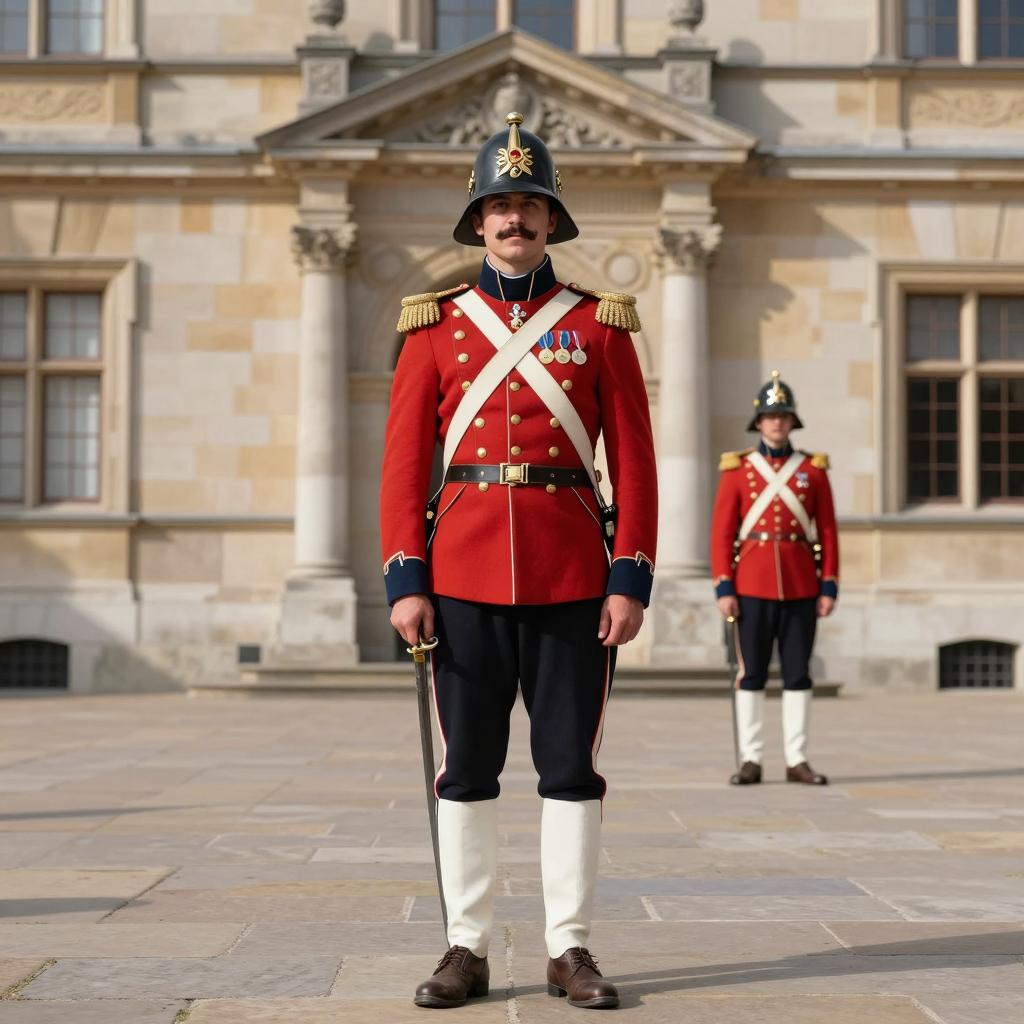 Male victorian fancy dress, photograph of a man in Victorian attire, standing on a cobblestone street, daytime, outdoor, full body shot, wearing a black top hat with red band, black double-breasted coat with epaulets, red tie, white ruffled cuffs, white gloves, black and red striped kilt, serious expression, mustache, historical setting, brick buildings with green and white striped awnings in background, sunlight, realistic, detailed ures, period costume, 19th century, town street, historical reenactment, medium shot, realistic style