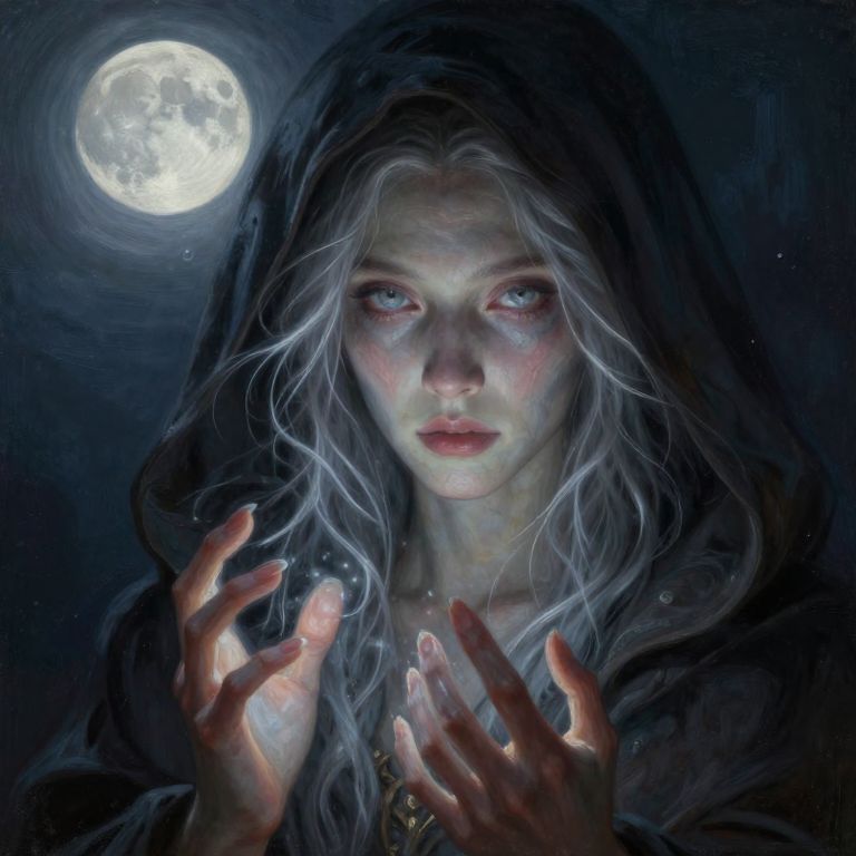 Digital artwork of a pale, ethereal woman with long, silver-white hair and piercing blue eyes, illuminated by a full moon in the dark night sky. She wears a dark hooded cloak, her hands raised in front of her, glowing with a soft, magical light. Her fingers are elongated and delicate, with a subtle, ghostly aura. Her expression is intense and mysterious, with slightly parted lips. The moon is bright and detailed in the top left corner, contrasting sharply with the dark, star-speckled background. The overall style is fantasy, with a focus on mystical and otherworldly elements.