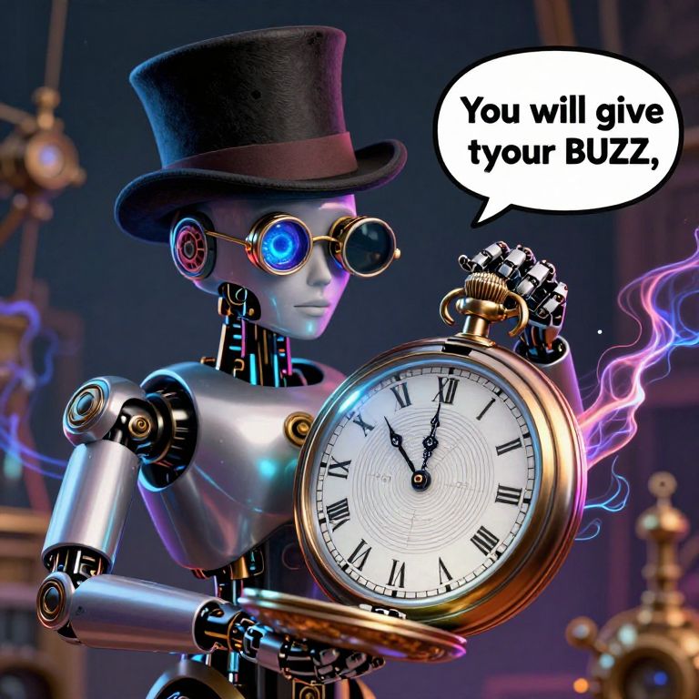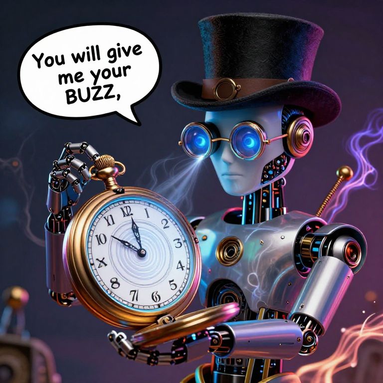 A photo of robotic hypnotist, wearing a top hat, wearing a monocle, eye magnified, holding a pocket watch, it sways hypnotically, motion lines of watch moving, hypnotic pattern on watch glass, glass, intricate light, intricate artwork, watch is metallic, mtlartCEstyle, Text bubble comes out of hypnotist that reads \"You will give me your BUZZ, \" electric plasma flows around edges of frame, colorful, steampunk