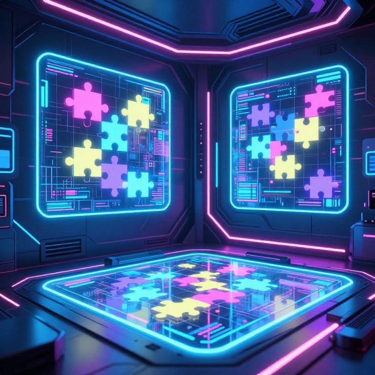 Futuristic neon-lit room filled with digital puzzels on transparent holographic surfaces, sleek metallic environment blending technology and art, glowing puzzle pieces changing colors dynamically, cyberpunk aesthetic with high detail and vibrant contrasts