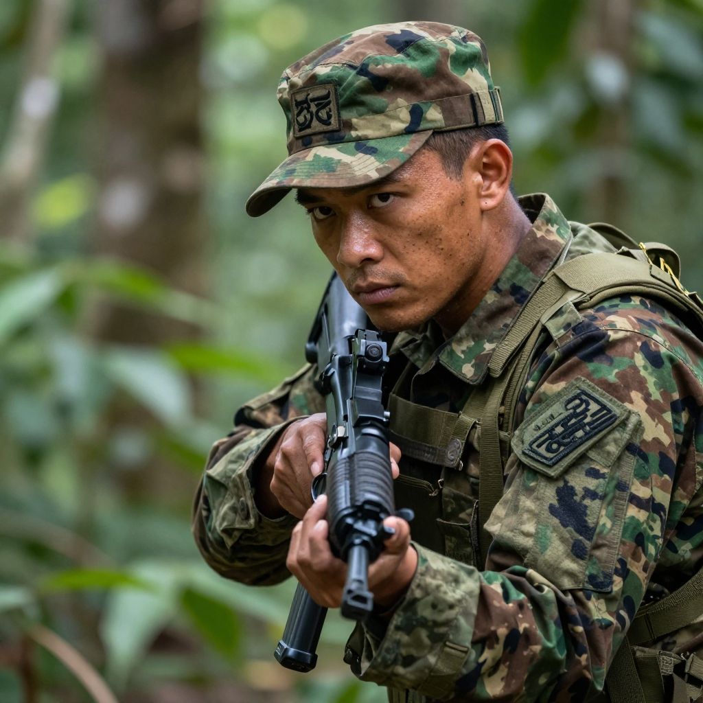 Photograph of a young male soldier with medium brown skin, wearing a camouflage uniform and cap, crouching in a dense, green forest. He holds a black submachine gun with both hands, aiming it forward with a focused expression. His uniform includes a tactical vest with visible patches on the right shoulder. The background is blurred with lush green foliage, emphasizing the soldier's alert posture. The image has a sharp, vivid quality, highlighting the soldier's determined face and the textures of his camouflage gear.