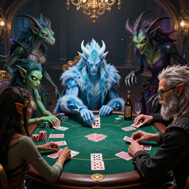 Digital art depicting five fantasy creatures, resembling elves and demons, playing poker around a green felt table. The central figure, a blue, horned, fur-clad creature with glowing eyes, deals cards. To the left, a green-skinned elf with black hair and leather armor observes. To the right, a dark green, clawed demon with purple fur leans in. In the foreground, an older, gray-bearded elf with glasses and a black vest holds cards. The background features a dimly lit, ornate room with a chandelier. Poker chips and a bottle of whiskey are on the table. The image is highly detailed with a fantasy gaming theme.