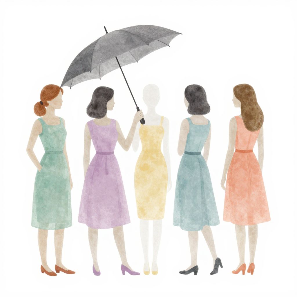 Watercolor illustration of five women standing side by side, viewed from behind. They wear knee-length dresses in pastel colors: green, lavender, yellow, blue, and peach. Their hair varies from red to black, styled in buns and loose waves. One woman holds a black umbrella above her head. They wear high-heeled shoes in matching pastel shades. The background is plain white, emphasizing the colorful dresses and diverse hair colors. The women's figures are lightly outlined, creating a soft, delicate aesthetic typical of watercolor art.