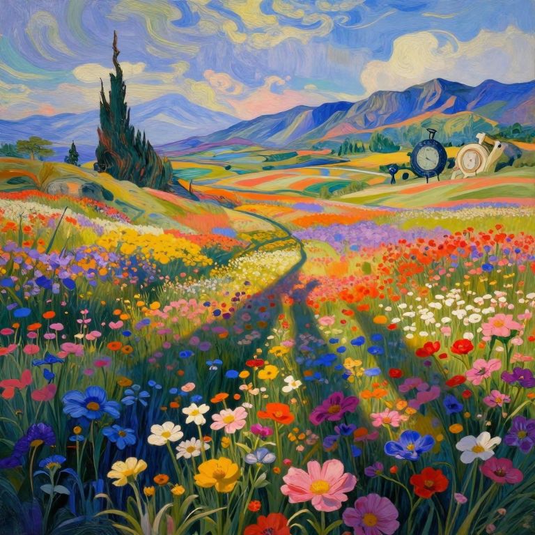Imagine an expansive panoramic view that seamlessly merges surreal elements reminiscent of Dali's dreamscapes with Van Gogh's vibrant landscapes. In this fantastical setting, a richly colored field of blooming flowers stretches towards a mountainous horizon, where time-bending mechanisms dangle from rocky ledges, their oscillating parts swaying delicately in the gentle wind. This captivating scene is captured from an elevated viewpoint, highlighting the vivid hues and intricate details of both the natural scenery and its whimsical components. As sunlight filters through the blossoms, creating a spectrum of shadows that dance with the fluidity of time, it generates a gradient of emotions that evokes a sense of marvel, contemplation, and serenity, beckoning viewers to delve into the mysteries of their own imagination.