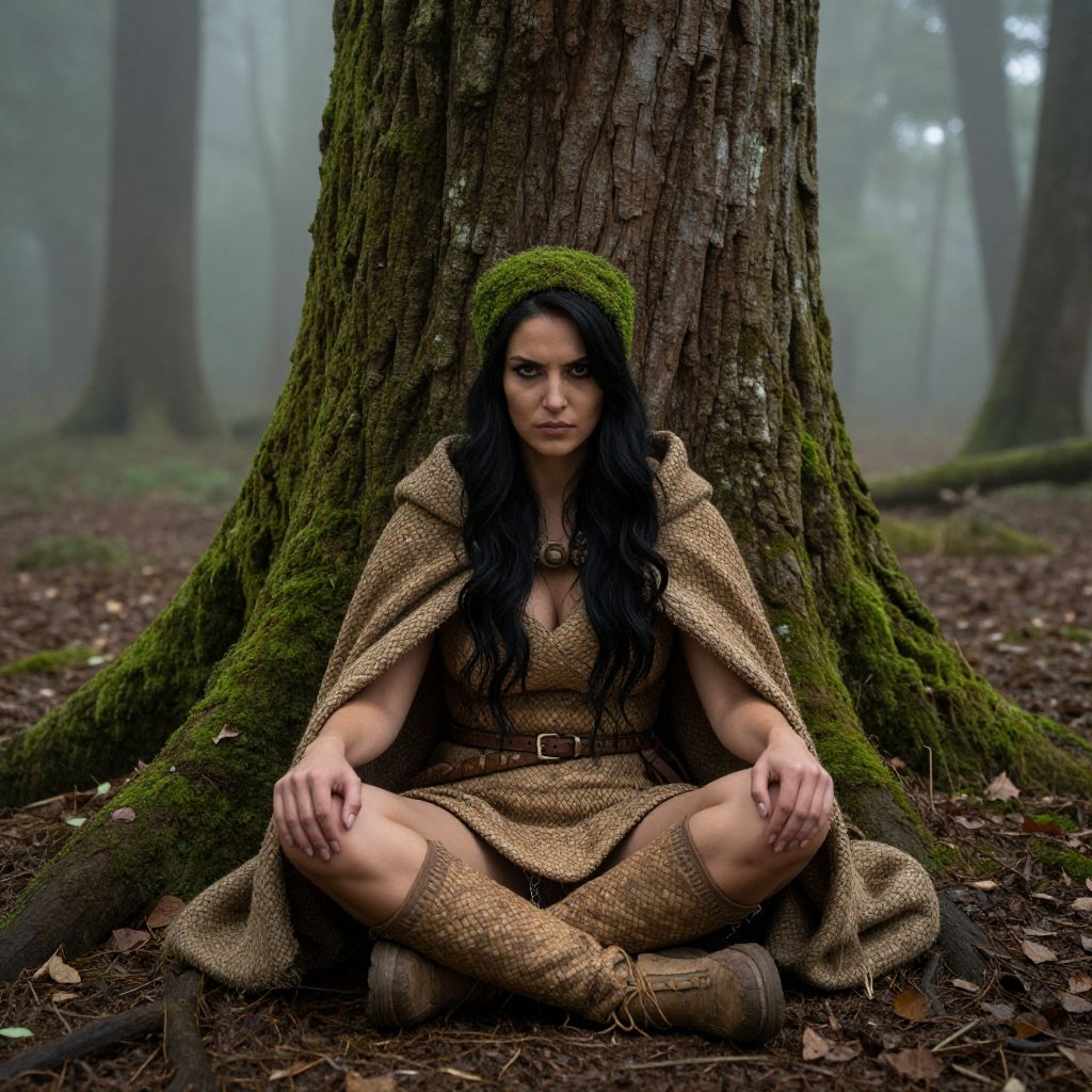 A photograph of a fierce-looking woman with long, dark hair, sitting cross-legged against a massive moss-covered tree in a misty forest. She's dressed in a woven, earthy-toned outfit with a green moss cap and cloak, her hands resting on her lap. The forest background is foggy, with tall trees and a ground covered in leaves and moss. She has a focused, intense expression.