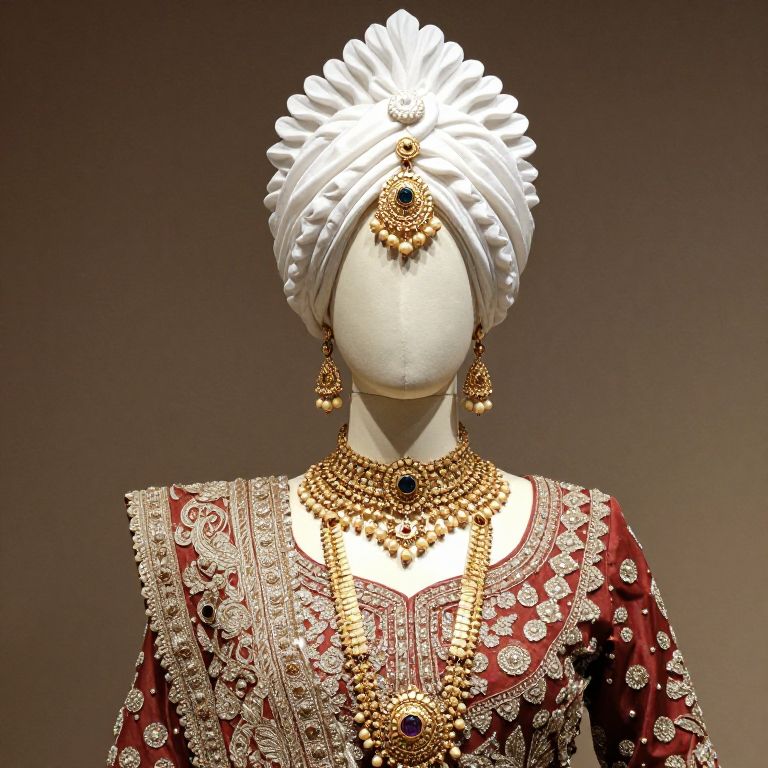 Mannequin wearing a traditional Indian outfit with gold jewelry and a white headdress.