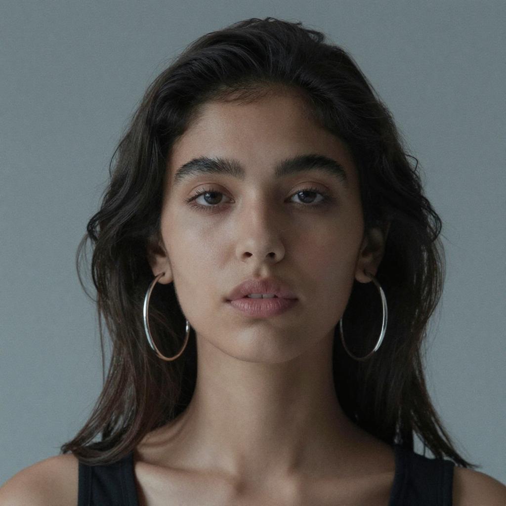 Photograph of a young woman with light skin and dark, wavy hair cascading over her shoulders. She has full lips, slightly arched eyebrows, and is wearing large, silver hoop earrings. Her expression is neutral, and she's against a plain, blue-gray background. The lighting is soft, casting gentle shadows on her face. The image has a slightly textured, grainy effect.