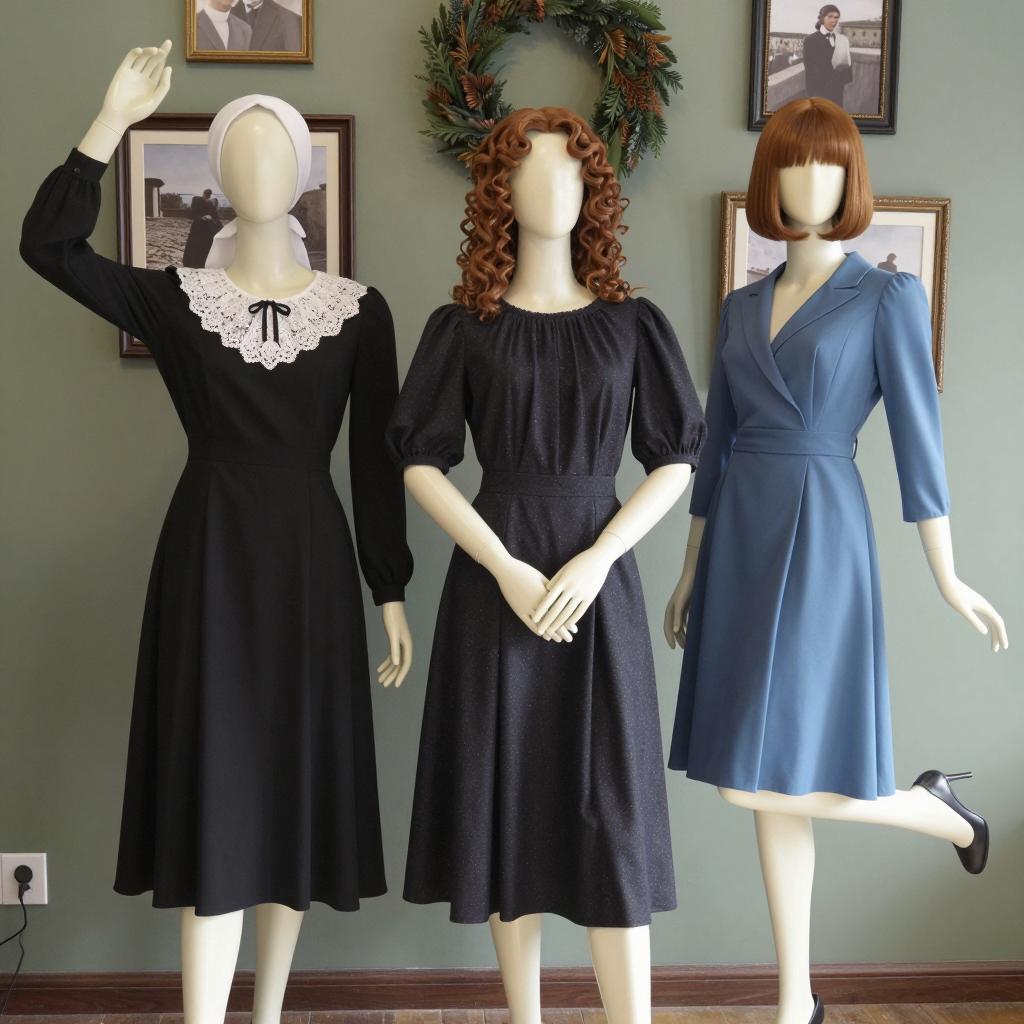 Photograph of three mannequins in vintage dresses. Left: black dress with white lace collar, white headscarf, right arm raised. Center: dark dress with puffed sleeves, curly brown hair, hands clasped. Right: blue dress, brown bobbed hair, left leg lifted. Green-lit room background with framed pictures and a wreath.