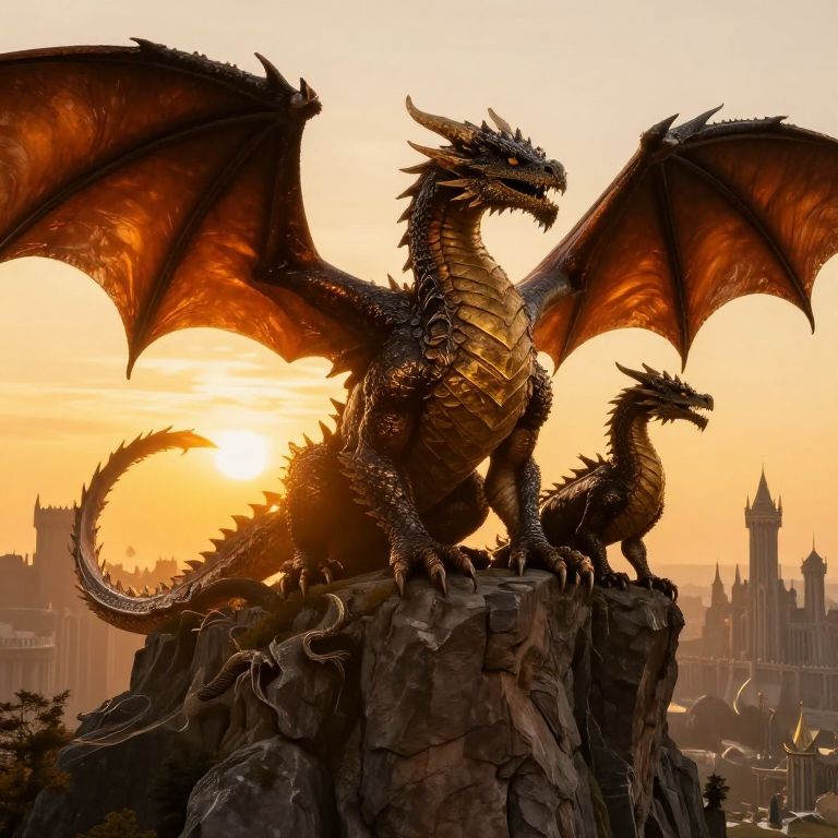 Majestic dragons perched on the edge of a cliff overlooking a medieval kingdom, their powerful forms illuminated by the golden glow of a setting sun, detailed scales and fierce eyes reflecting wisdom and strength, fantasy art style.