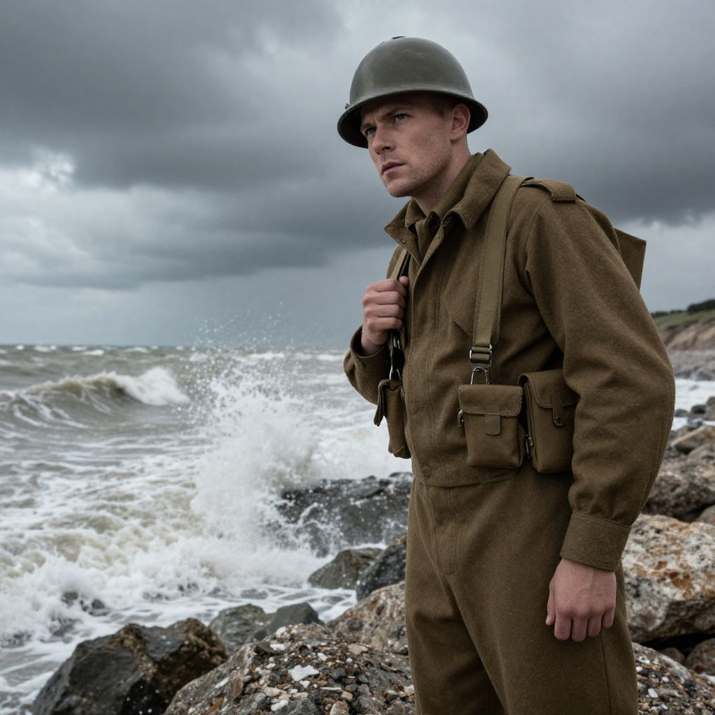[[man,d-day pictures]]Dramatic, cinematic composition: A soldier in WWII uniform stands resolute on the rugged Normandy coast, as the tumultuous waves crash against the shore, while dark clouds gather above, casting an ominous shadow. The camera captures his determined gaze at a 45-degree angle, emphasizing his bravery amidst the chaos of D-Day. Man has masculine face and piercing eyes