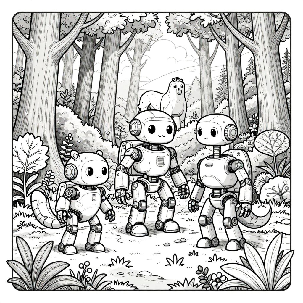 AI coloring page portraying a dynamic fusion of nature and AI, featuring robotic animals harmoniously integrated into a forest environment, designed with elegant line work and open spaces for vibrant coloring fun.