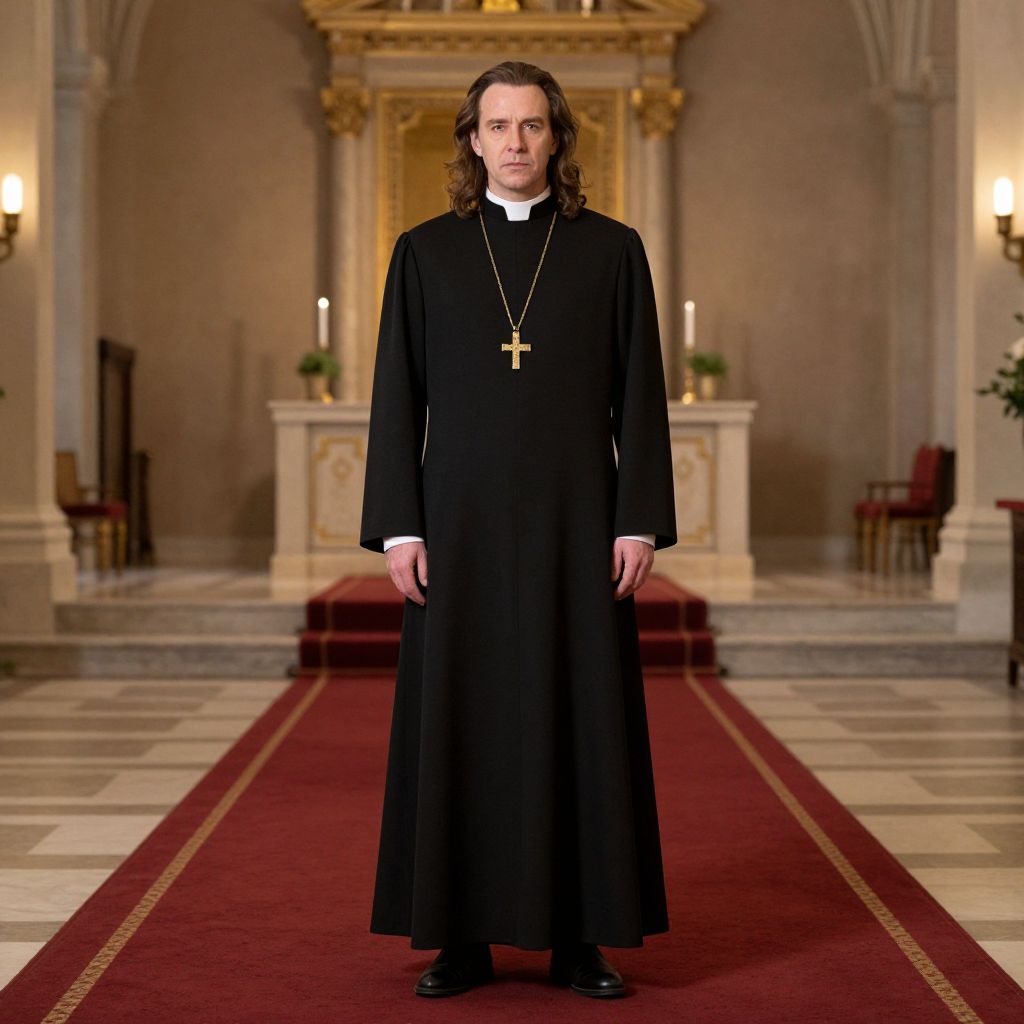 Photograph of a solemn, long-haired man in black clerical robes and gold cross necklace, standing in an ornate, dimly-lit church