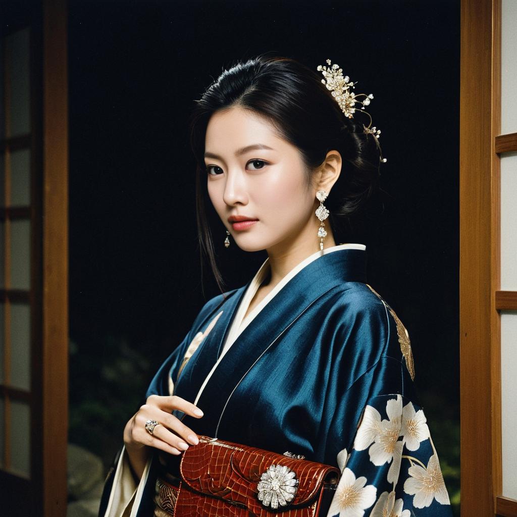 Edo Period Japan. Night. A slim woman with striking dark amber that contrast with her fine face with clear lines and distinctive features. She wears a sparkling diamond ring and earrings with eye-catching gemstones. She wears a custom-tailored silk kimono made from the finest fabrics and carries a high-quality leather handbag in a simple design. Her hair has a natural shine and is so supple that it flows in the wind when she moves. It falls to the middle of her back and is often worn in a simple but elegant style that accentuates her distinctive features.