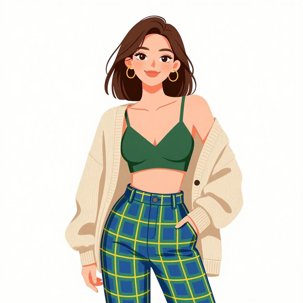 Woman with pretty face and pretty hair. smiling Woman, casual, oversized rib-knit cardigan in beige, open front, dropped shoulders, long sleeves, dark green bralette, high-waisted plaid trousers in blue and green with yellow accents, pockets, plain white studio background. --sref 1467
