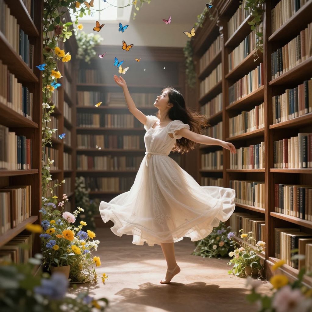 Photograph of a woman in a white, flowing dress, joyfully dancing in a sunlit library aisle, surrounded by fluttering butterflies and colorful flowers