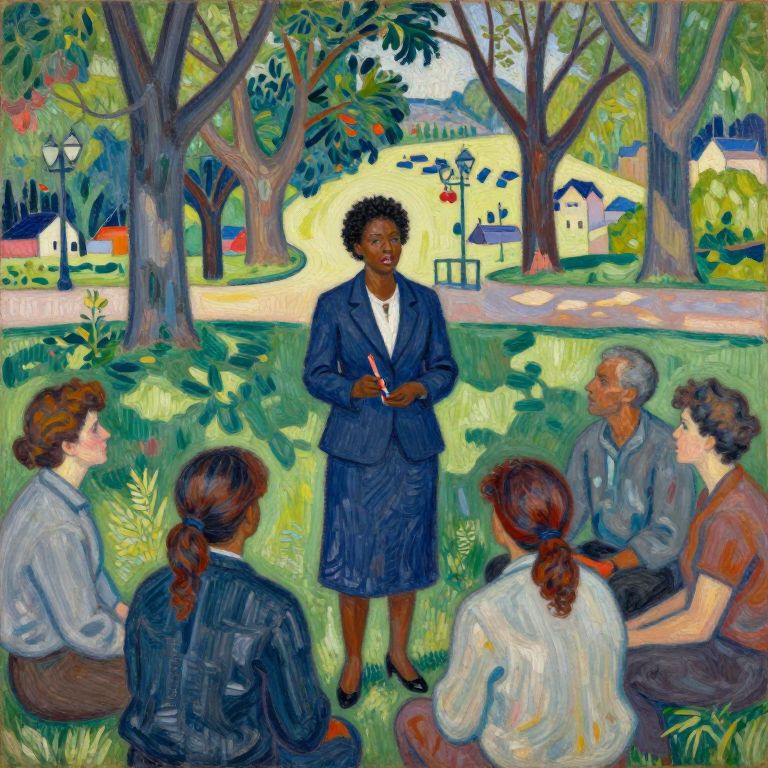 Pastel Pencil Black female politician, speaking to 5 people, in a park, detailed and intricate, trees in background, rural community mile away in distance, positive, shadows, painting by Fauvism,