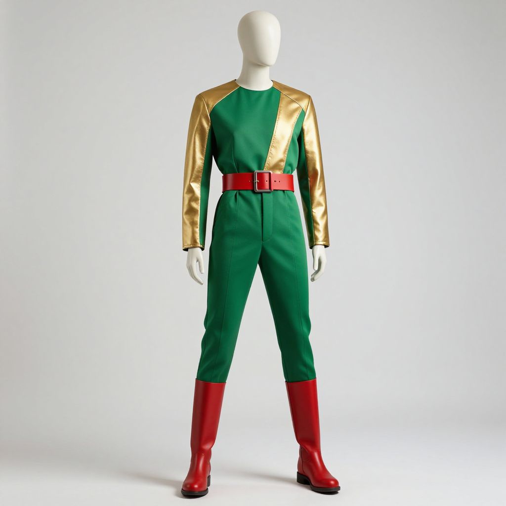 A mannequin wearing a green and gold outfit with a red belt and boots, designed to be highly detailed and realistic, with a sleek, modern aesthetic, and a confident, stylish posture, standing in a minimalist, well-lit environment, emphasizing the vibrant colors and sharp lines of the outfit, with the mannequin's expression conveying a sense of elegance and sophistication, and the overall scene is carefully composed to highlight the fashion statement and the bold color combination of the outfit.
