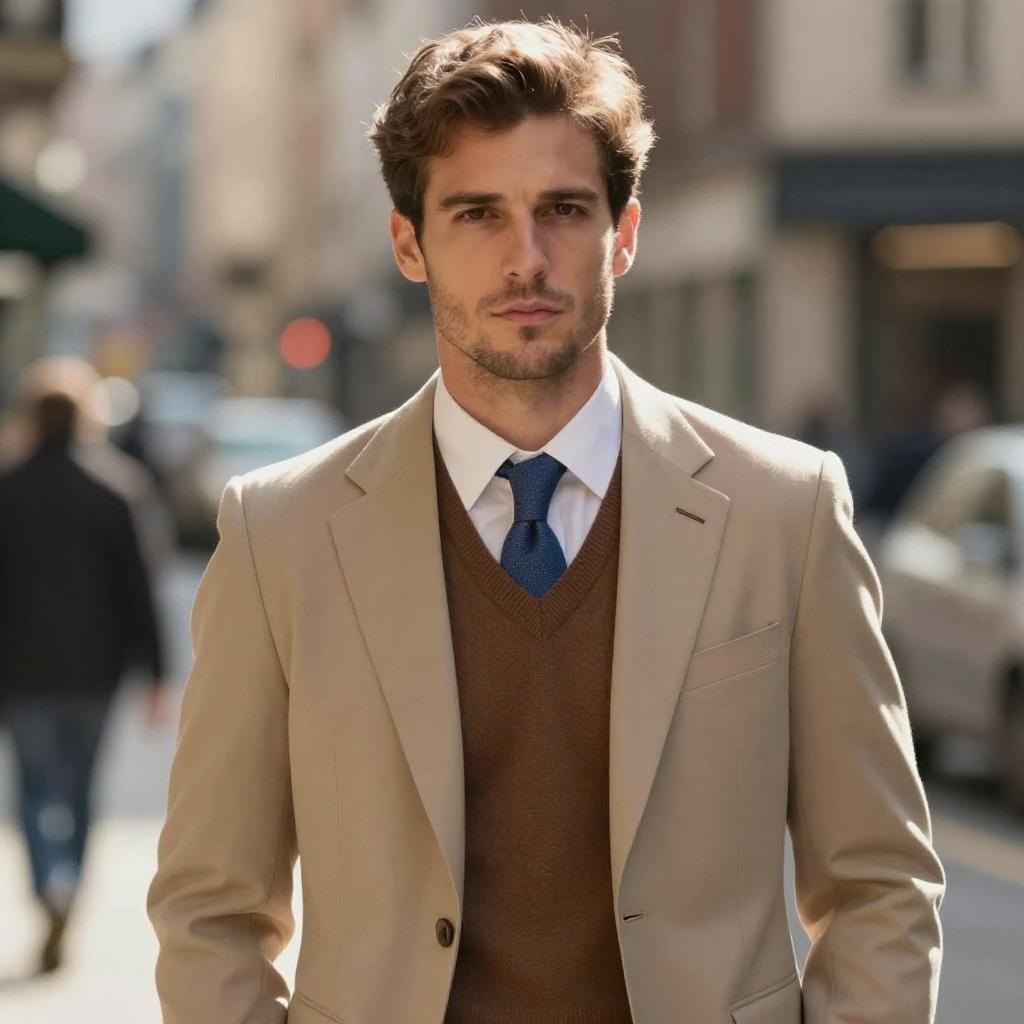 Photograph of a handsome, light-skinned man with short brown hair, wearing a beige suit, brown V-neck sweater, and blue tie. He stands in a city street with a slightly blurred background, creating a shallow depth of field. The lighting is natural, with warm, golden sunlight. The camera angle is eye-level, capturing his serious expression. Background is out of focus, emphasizing the subject.