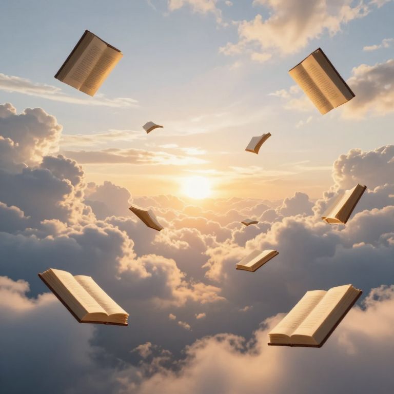 Books float gracefully through a luminous sky, their pages aglow with golden light, creating a celestial pathway between towering clouds that frame a radiant, sunlit horizon.