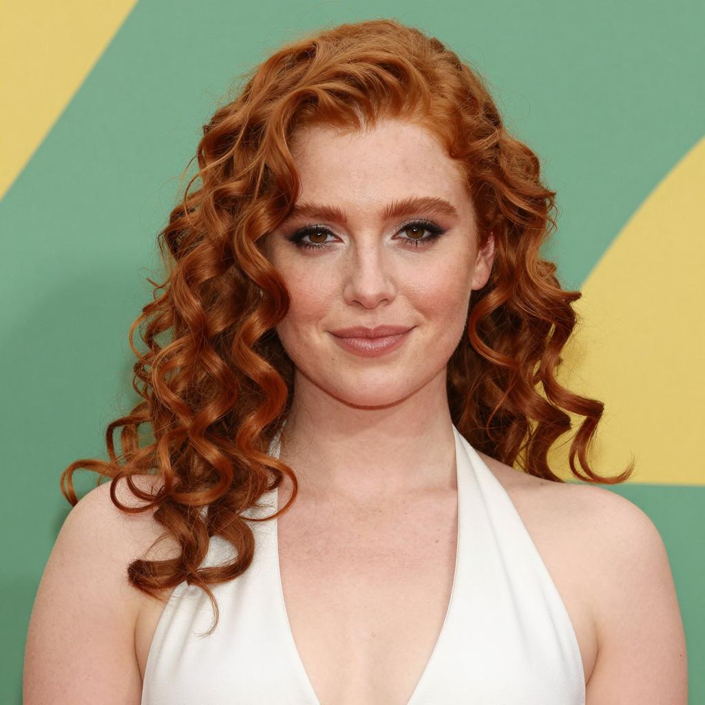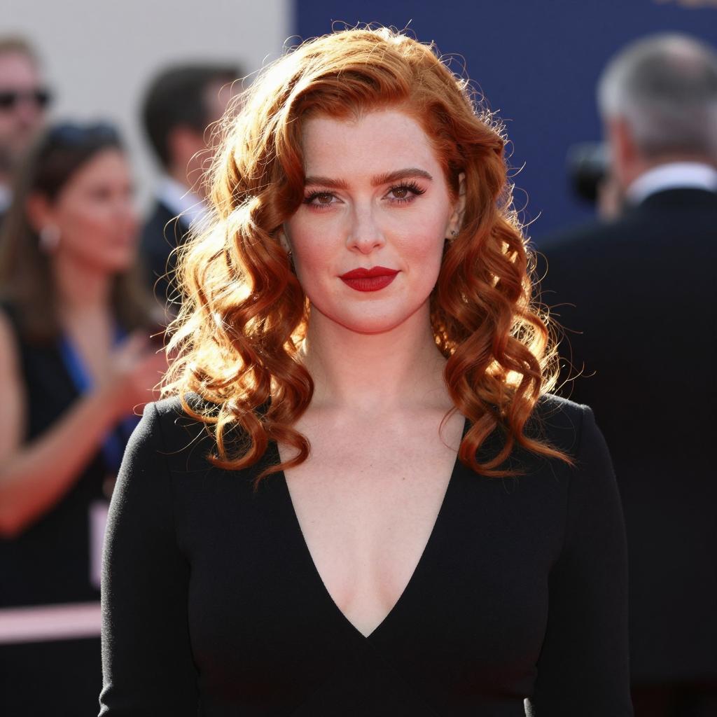 Photograph of a woman with curly red hair, fair skin, and red lipstick, wearing a dark blue military-style jacket with gold trim and a silver pin on the left side. She smiles slightly, looking upward. Background includes a ured tree trunk and dried branches on the left.
