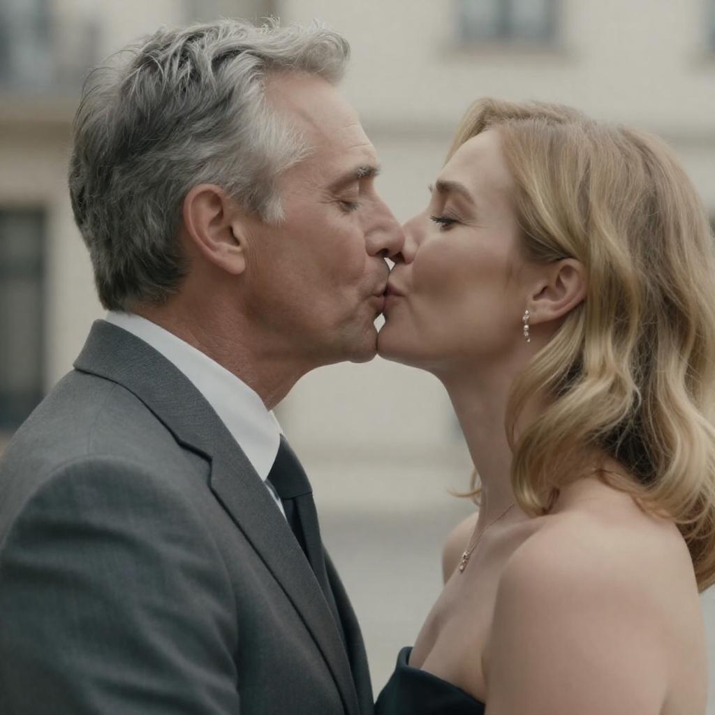 Photograph of a middle-aged man and woman kissing. Man has gray hair, wears a gray suit, faces left. Woman has blonde hair, wears a strapless top, faces right. Soft lighting, blurred background. Intense eye contact.
