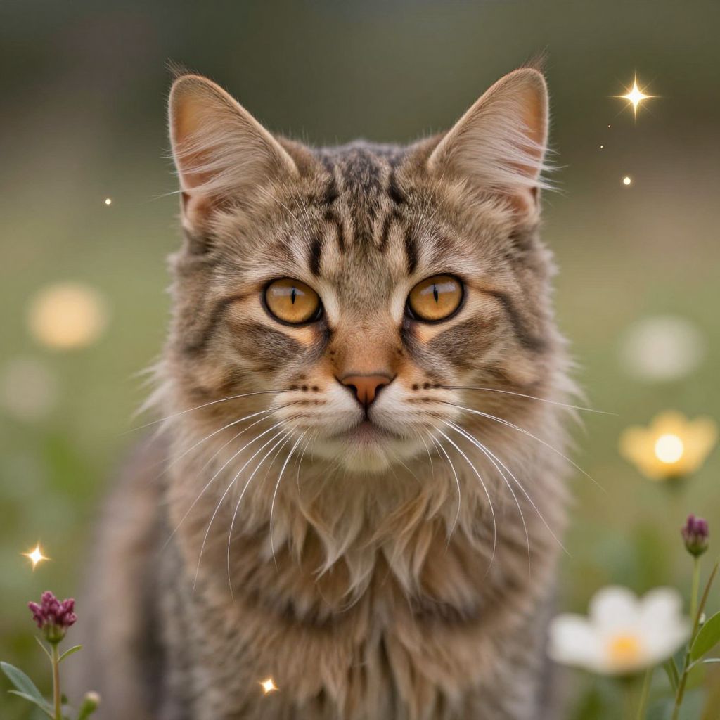 Photograph of a long-haired, tabby cat with flowing, wavy golden-brown fur, green eyes, and white chest, sitting in a