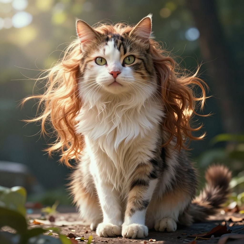 Photograph of a long-haired, tabby and white cat with a regal appearance, standing on a sunlit forest path. The cat's fur is lush and flowing, with a prominent, wavy mane that frames its face and extends down its chest. Its green eyes are wide and alert, gazing directly at the camera. The background is softly blurred with sunlight filtering through trees, creating a bokeh effect. The cat's front paws are planted firmly on the ground, and its tail is curled slightly. The sunlight highlights the cat's fur, giving it a golden sheen. The overall mood is serene and majestic.