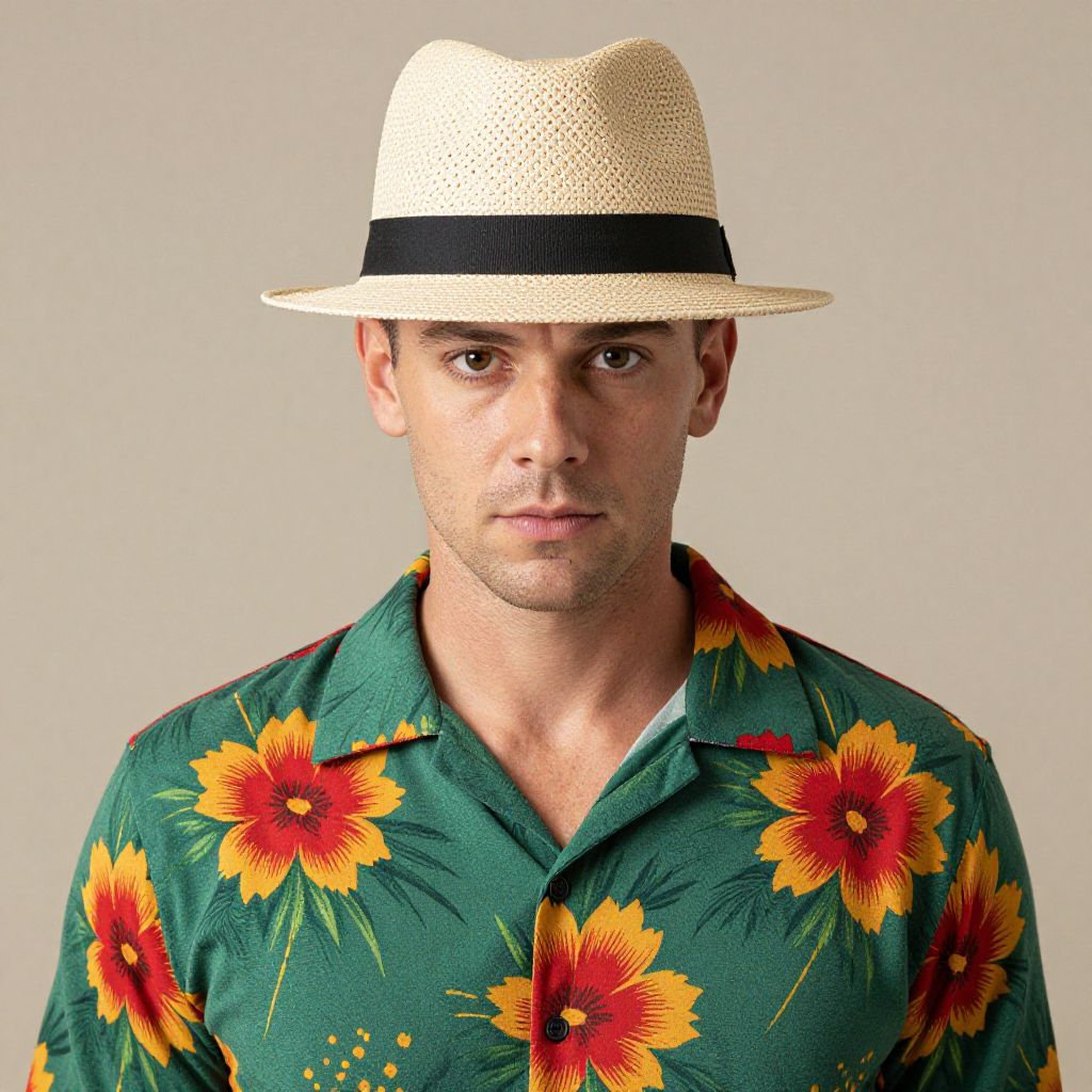 Photograph of a serious-looking man wearing a beige straw hat with a black band, and a green shirt adorned with large red and yellow flowers.