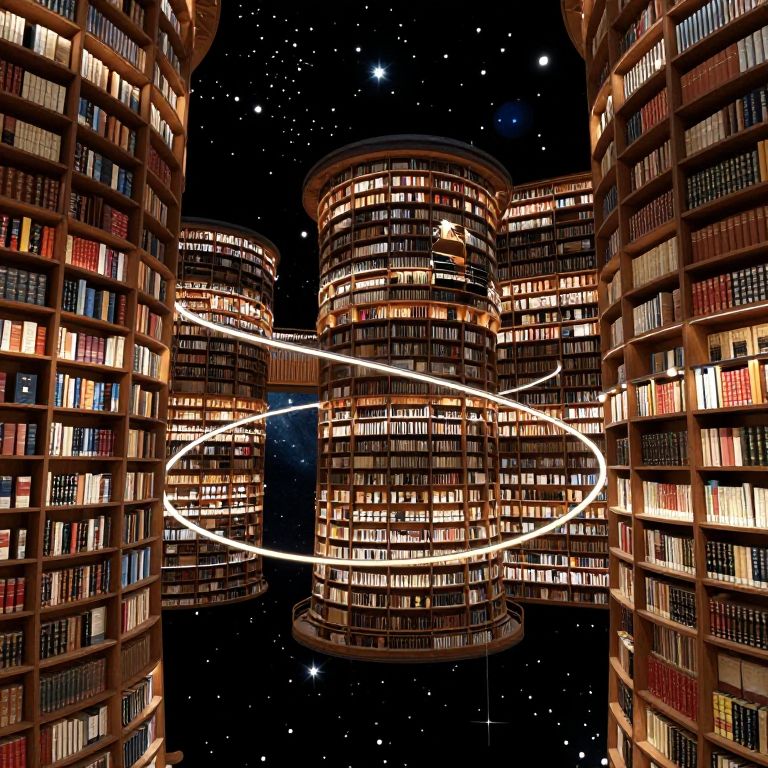 An ancient library floating in space, its endless bookshelves orbiting one another like constellations of knowledge.