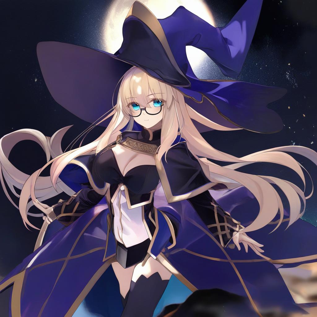 Aesc (fate), fate/grand order, 1girl, blue eyes, glasses, blonde hair, long hair, very long hair, large breasts, witch hat, long sleeves, by artist shirokitsune, leet