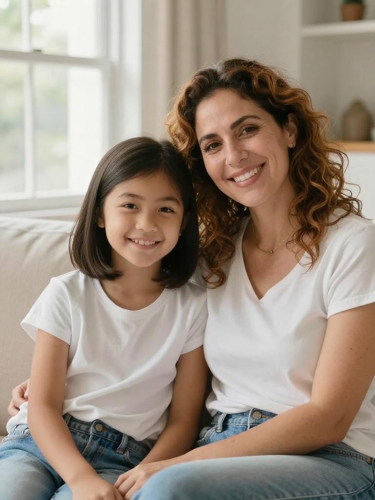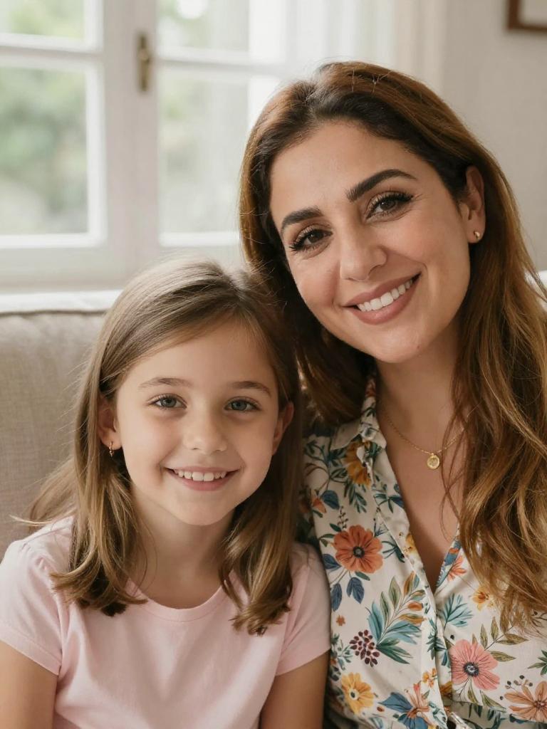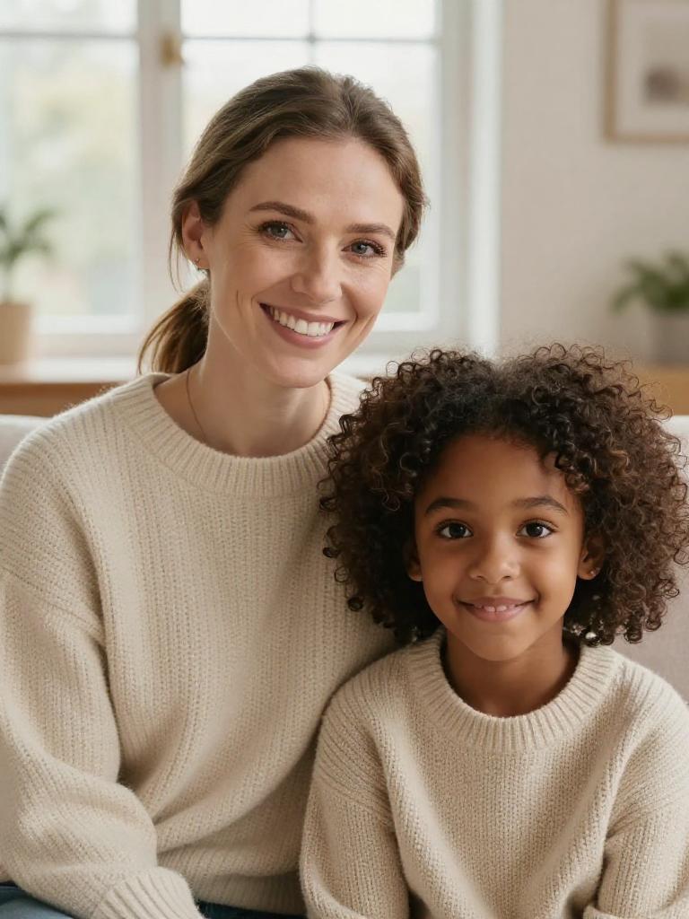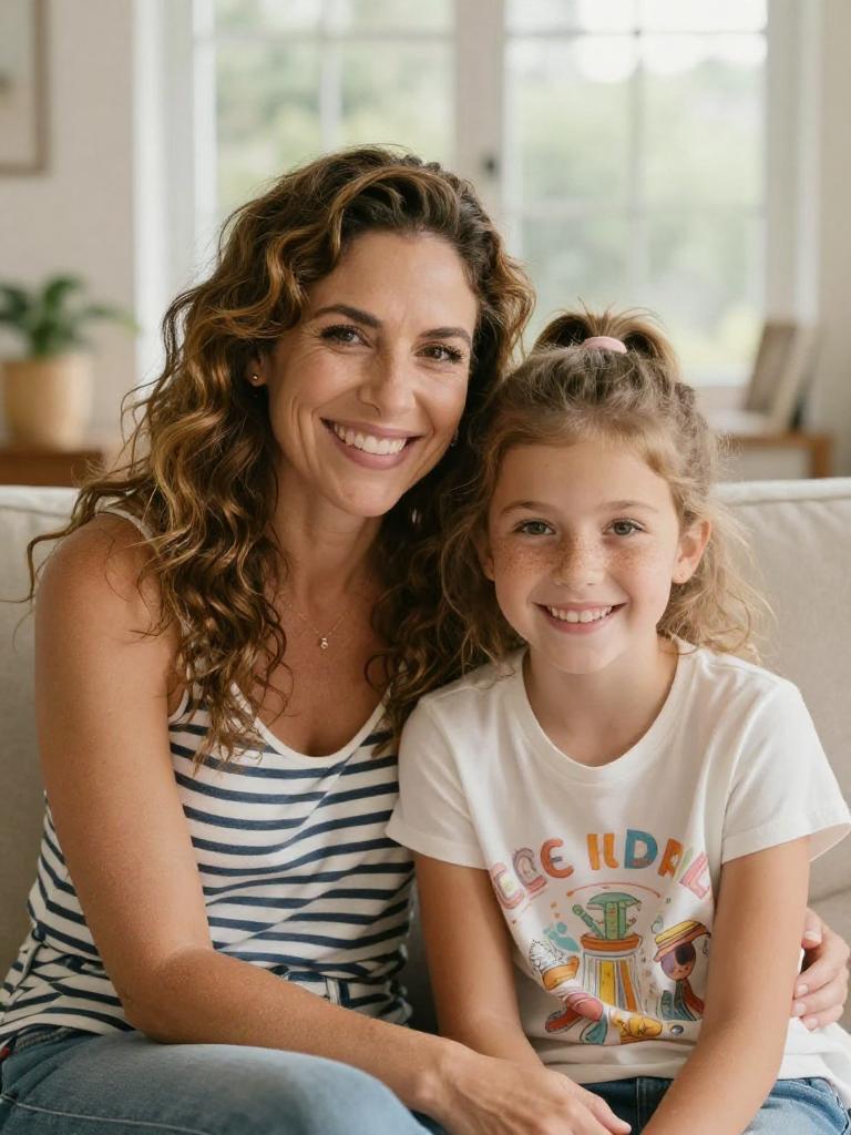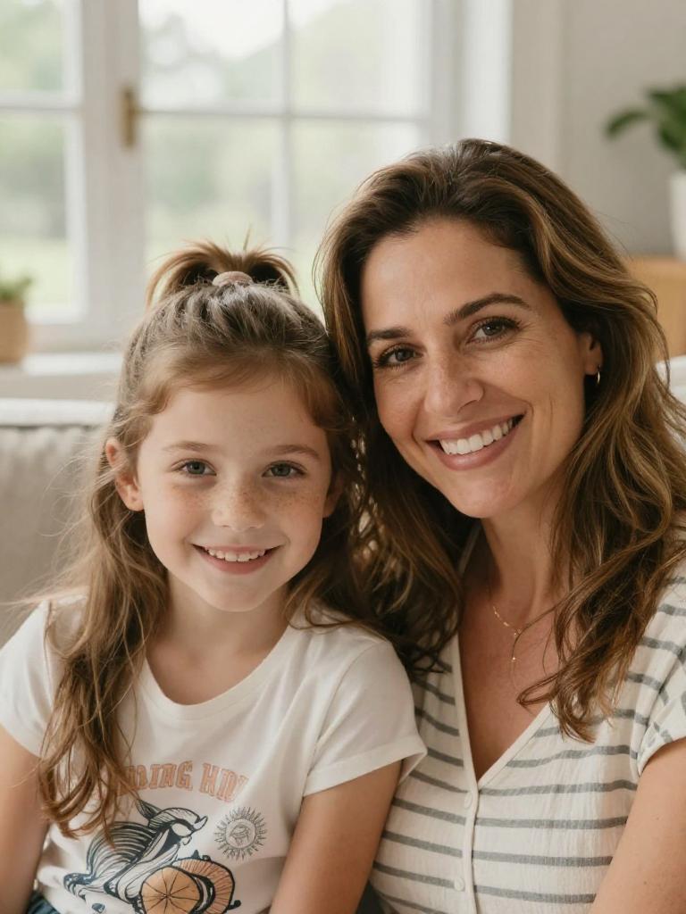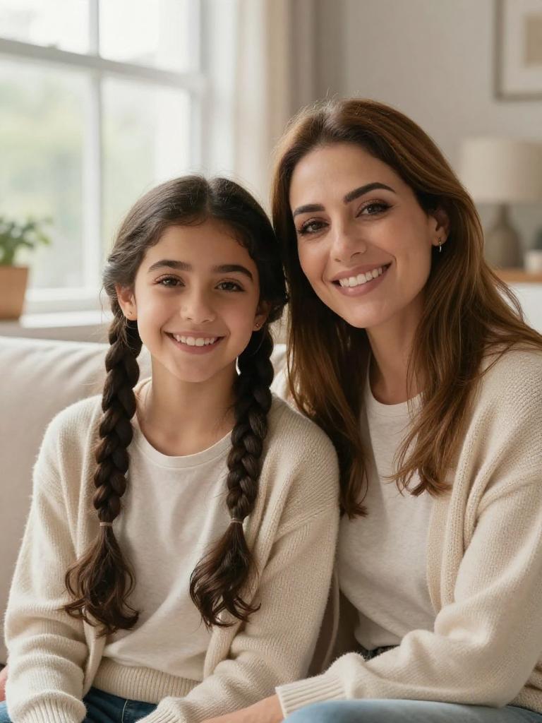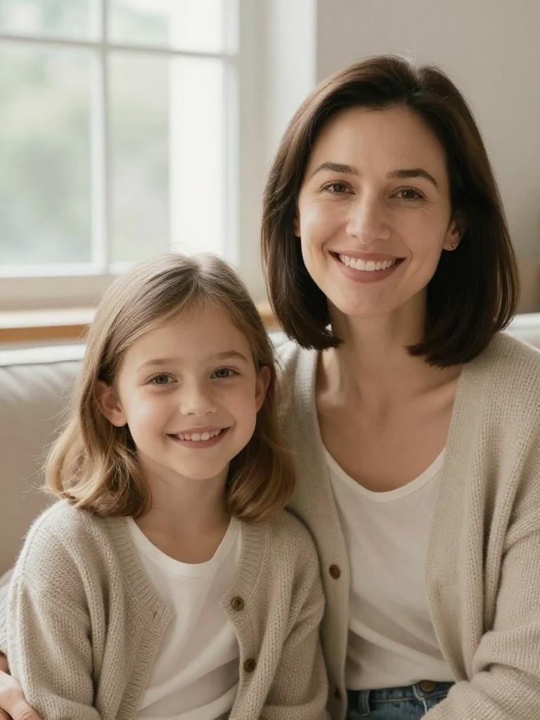 Mother and daughter, close-up portrait of a smiling mum and preteen girl sitting together on a sofa, brunette woman with shoulder-length straight hair and warm smile and girl with light-brown wavy hair and wide grin, both looking at the camera, cozy cardigans layered over cotton tops, bright airy living room with large window and soft natural daylight, cozy family lifestyle stock photo, high resolution, ultra-detailed