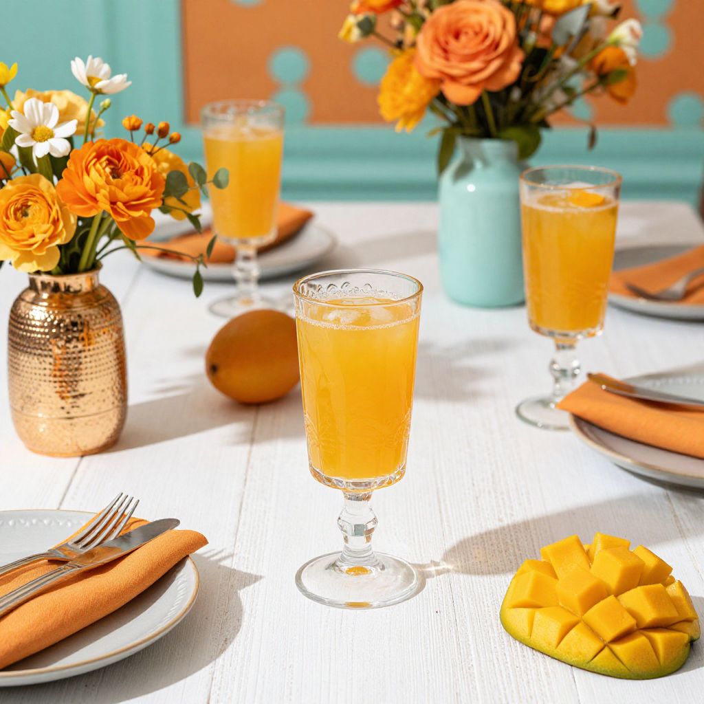 Cheerful yellow and navy blue decorations hang above a wooden table set for a child's birthday party, featuring a three-tiered yellow cake, cupcakes, fresh fruit, vibrant flowers, and neatly arranged place settings with orange plates and silverware.