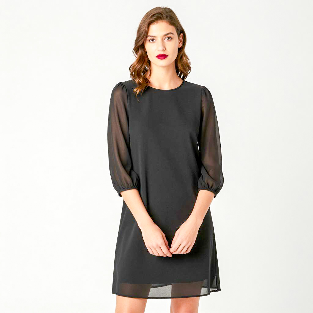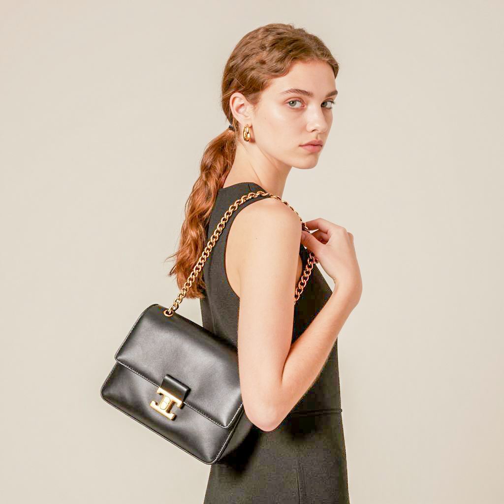 Photograph of a young woman with fair skin and brown hair in a ponytail, wearing a black sleeveless dress. She holds a black leather handbag with gold hardware and chain straps over her shoulder. She has gold hoop earrings and looks over her shoulder to the right. The background is a plain, neutral beige color. Her facial expression is neutral.