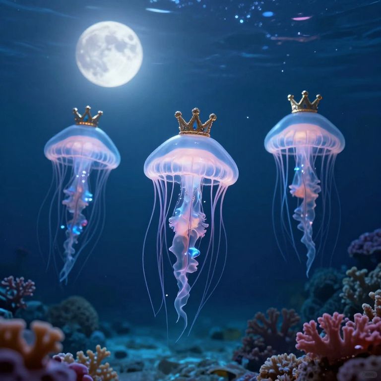 Photograph of three glowing jellyfish wearing golden crowns, floating in a deep blue ocean under a bright full moon, surrounded by colorful coral reefs.