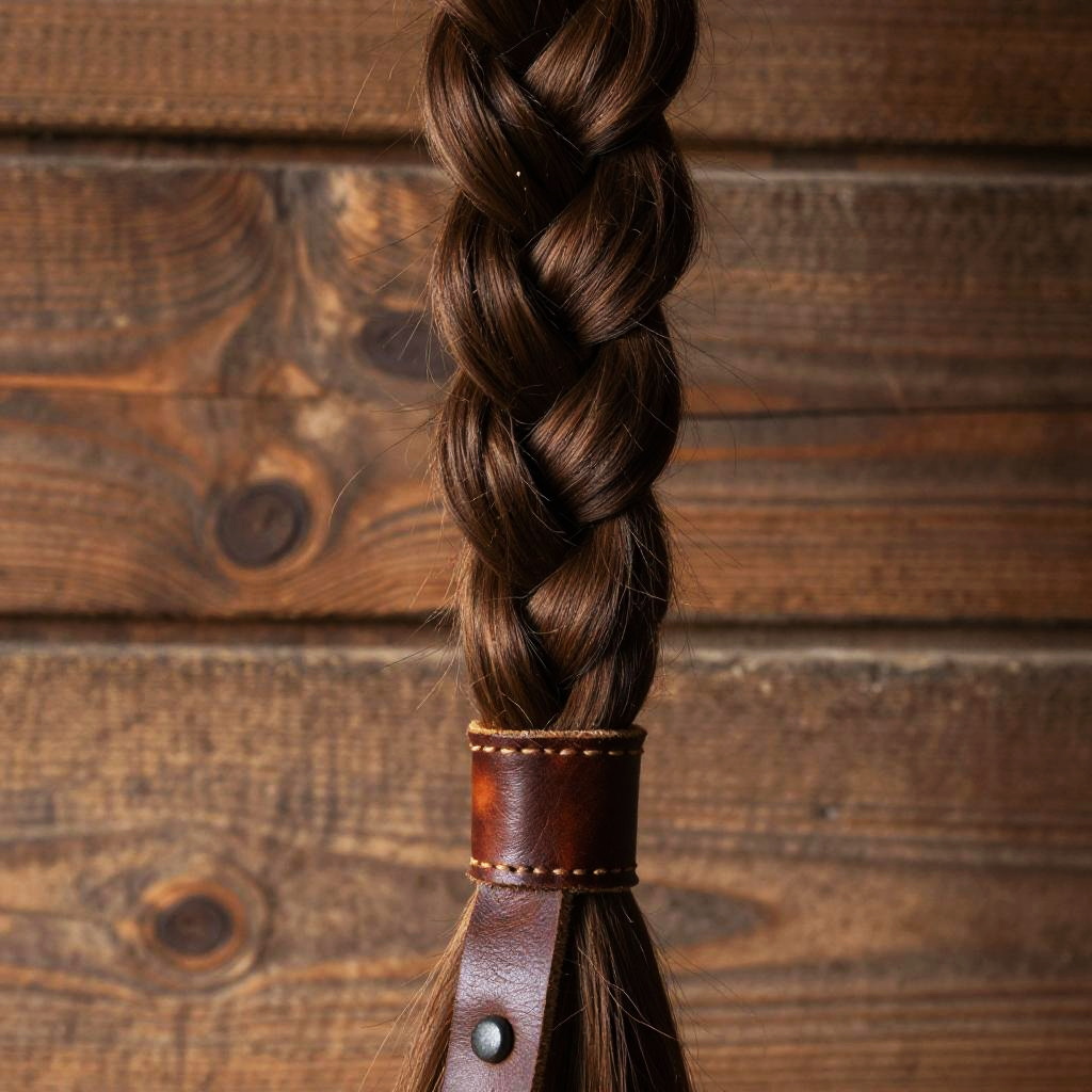 Close-up of Cossack hair style braid intertwined with leather bands, rustic wooden background, warm natural lighting, capturing cultural heritage and craftsmanship, hyperrealistic detail