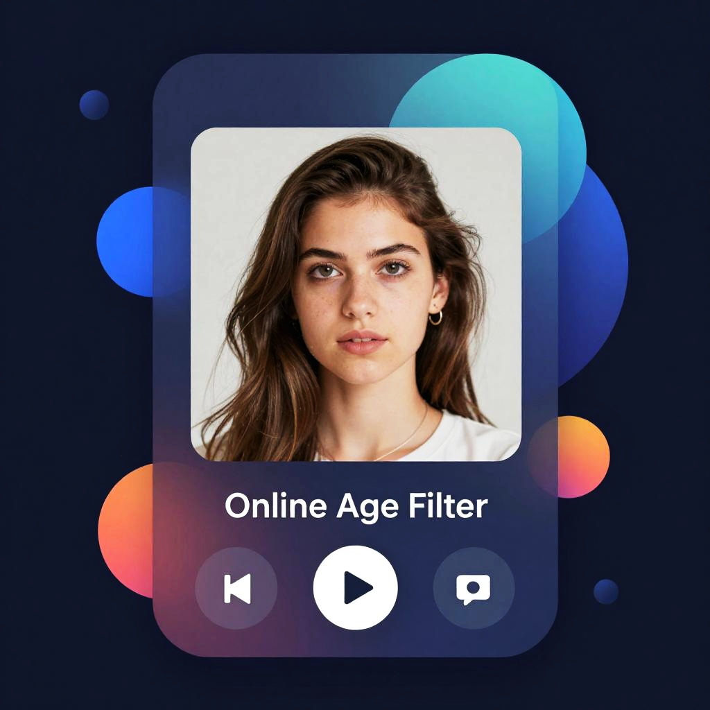Illustration of an online age filter being applied to a profile photo, vibrant digital overlays with geometric shapes and smooth gradients, showing a futuristic user interface with intuitive controls on a dark mode background, emphasizing accessibility and security.