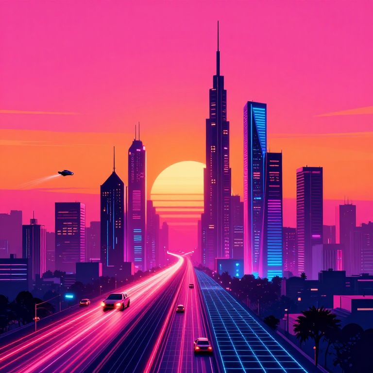 Synthwave art style futuristic city skyline with towering neon-lit towers, flying cars leaving pulsating trails, glowing grids on roads and buildings, sunset with intense pink and orange gradients, retro digital sun on the horizon, surreal and vibrant