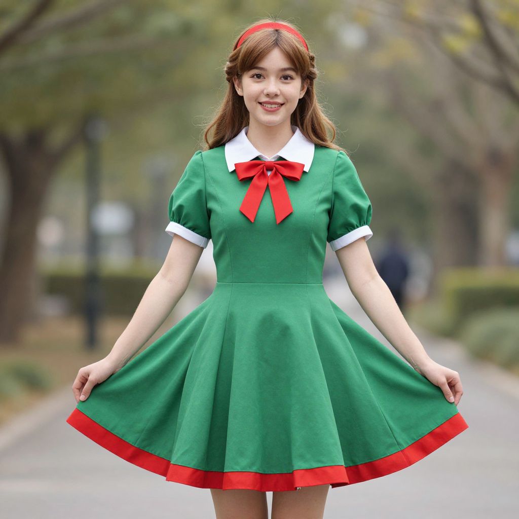 Photograph of an Asian woman with fair skin and long brown hair, wearing a green, short-sleeved, A-line dress with a white collar and red bow at the chest. The dress has red trim along the hem and sleeves. She also wears a red headband. She stands on a paved pathway in a park, holding the sides of her dress out slightly, smiling. The background is blurred with trees and a few indistinct figures, creating a soft, natural setting. The overall style is reminiscent of a vintage or retro schoolgirl outfit.