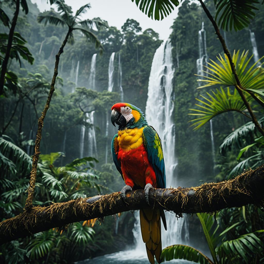 Photorealistic image of a striped tiger prowling through dense jungle foliage with morning mist. In the background, an ancient stone temple ruin is visible, adding a historical and mystical element to the scene. The image features sharp focus and depth of field, captured with an 18mm lens effect, highlighting the tiger's detailed fur and the lush greenery surrounding it.