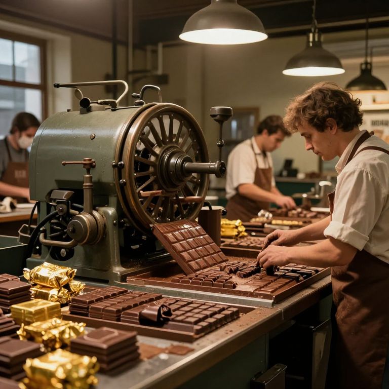 Hersey chocolate factory interior with vintage machinery and workers crafting artisanal chocolates, soft warm lighting, rich browns and gold hues, detailed textures of chocolate bars and foil wrappers, nostalgic and cozy industrial setting, realistic style.