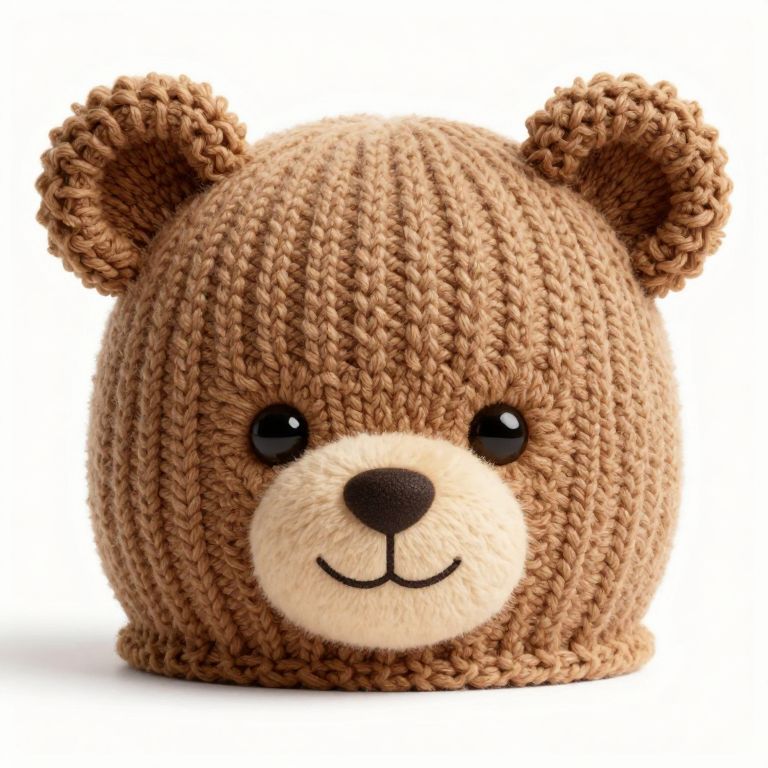A whimsical knitted hat transforms into a cheerful teddy bear face, defying the boundaries between textile craft and animated character with its playful, oversized features and endearing smile.
