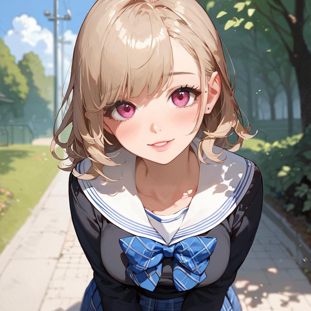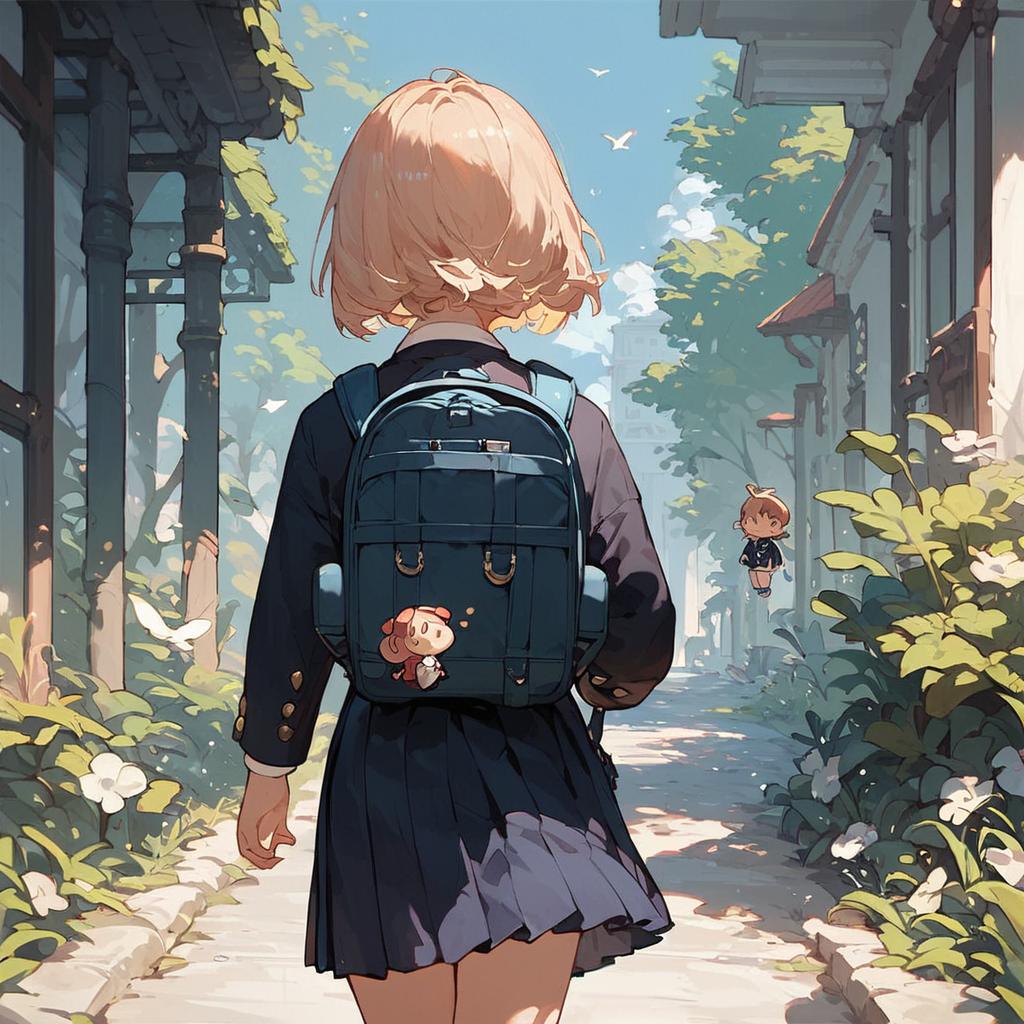 Score_9, score_8_up, score_7_up, source_anime, cowboy shot1girl, chibi, walking, school blazer, skirt, randoseru, backpack, from behind, 0, 1, 0>