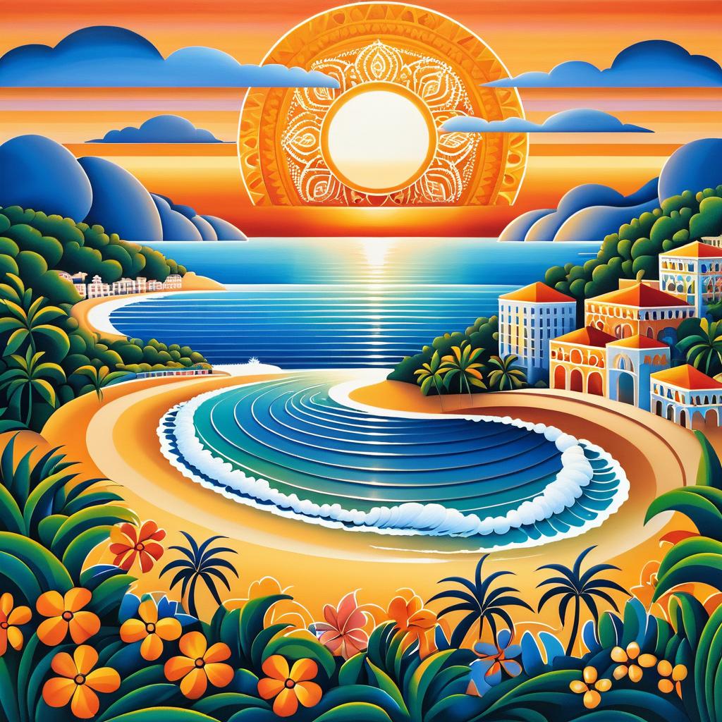 Fine detail digital painting of Rio de Janeiro beaches at sunset, inspired by Tarsila do Amaral style. The image features vibrant colors with an ornate and intricate depiction of waves, sandy shore, lush vegetation, mountains, and classic architectural buildings along the coastline. The sun is low on the horizon, casting warm golden reflections over the ocean and landscape.