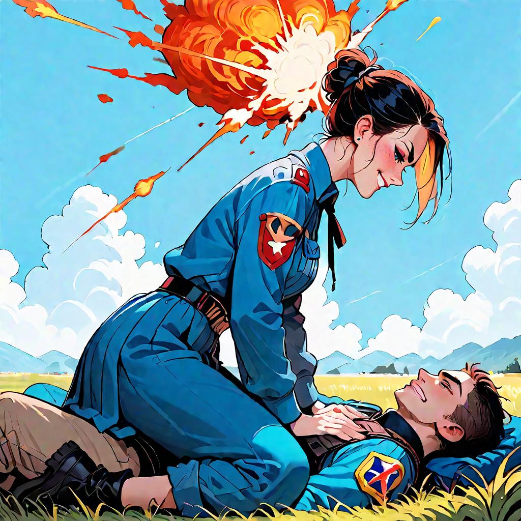 Score_9, score_8_up, score_7_up, source_anime, shouting, piggyback riding, sitting on person, all fours, femdom, girl on top, human chair, 1boy, 1girl, from side, profile, explosion, grass, early modern soldier, charge, arm up, smile