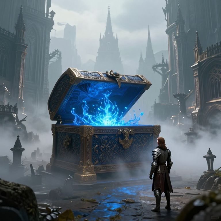 In this captivating fantasy scene, a giant, ornate box filled with a vibrant blue mana stands as the centerpiece, its surface adorned with intricate carvings and a glowing, ethereal light emanating from within. The box is positioned in the center of a misty, ancient cityscape, with towering, gothic-style buildings rising in the background, their spires reaching towards the sky. The city is shrouded in a veil of fog, adding to the mystical atmosphere. A lone figure, dressed in medieval armor, stands in the foreground, gazing at the box with a sense of wonder and curiosity. The overall composition is balanced, with the box and the figure creating a focal point that draws the viewer's eye into the scene. The interplay of light and shadow, combined with the rich textures of the box and the detailed architecture of the city, creates a sense of depth and immersion, transporting the viewer into this fantastical world.
