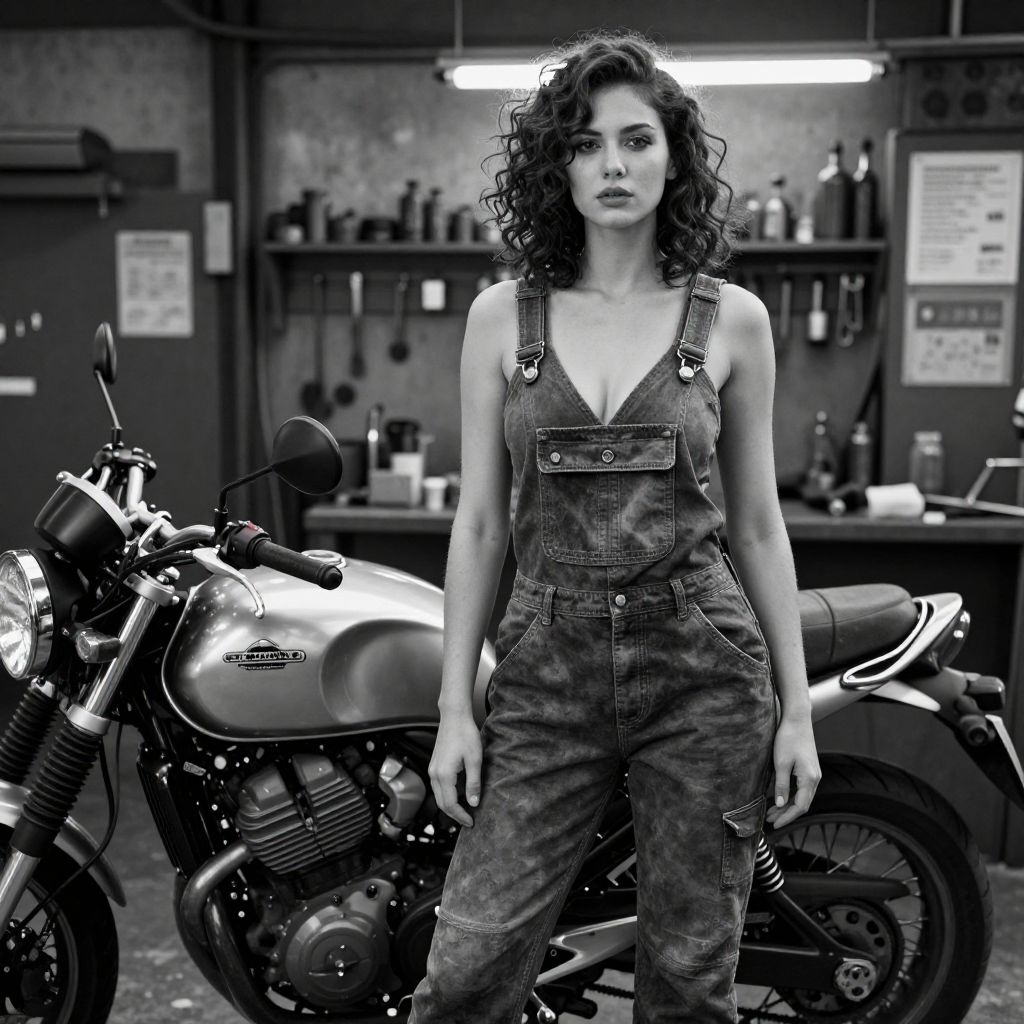 Black-and-white photograph of a curly-haired woman with a serious expression, standing in front of a vintage motorcycle in a dimly lit garage. She wears a deep V-neck denim overall with suspenders, exposing a modest cleavage. The motorcycle, featuring a shiny tank and classic design, is positioned to her left. The background shows shelves with various tools and bottles, and a cluttered workbench. The image has a high-contrast, moody aesthetic, emphasizing the textures of the denim and the motorcycle's metal parts. The woman's confident stance and the garage setting evoke a rugged, DIY atmosphere.