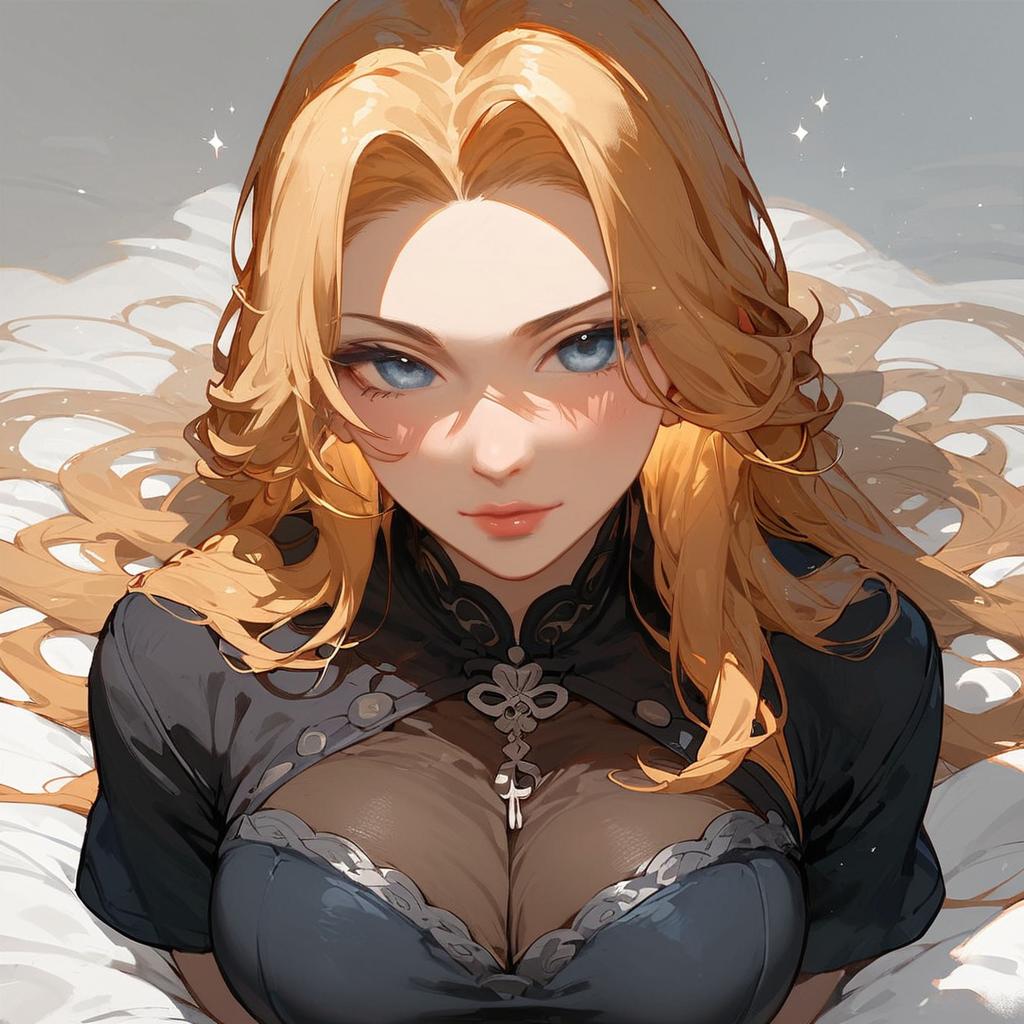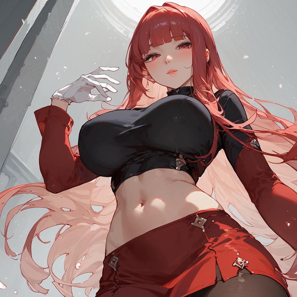 Score_9, score_8_up, source_anime, 1girl, blunt bangs, very long hair, black bodysuit, turtleneck, crop top, red sleeves, red skirt, white gloves, black pantyhose, (large breasts:0.7), looking at viewer, furrowed brow, expressionless, from below, dark room, pedestal, stairs, standing