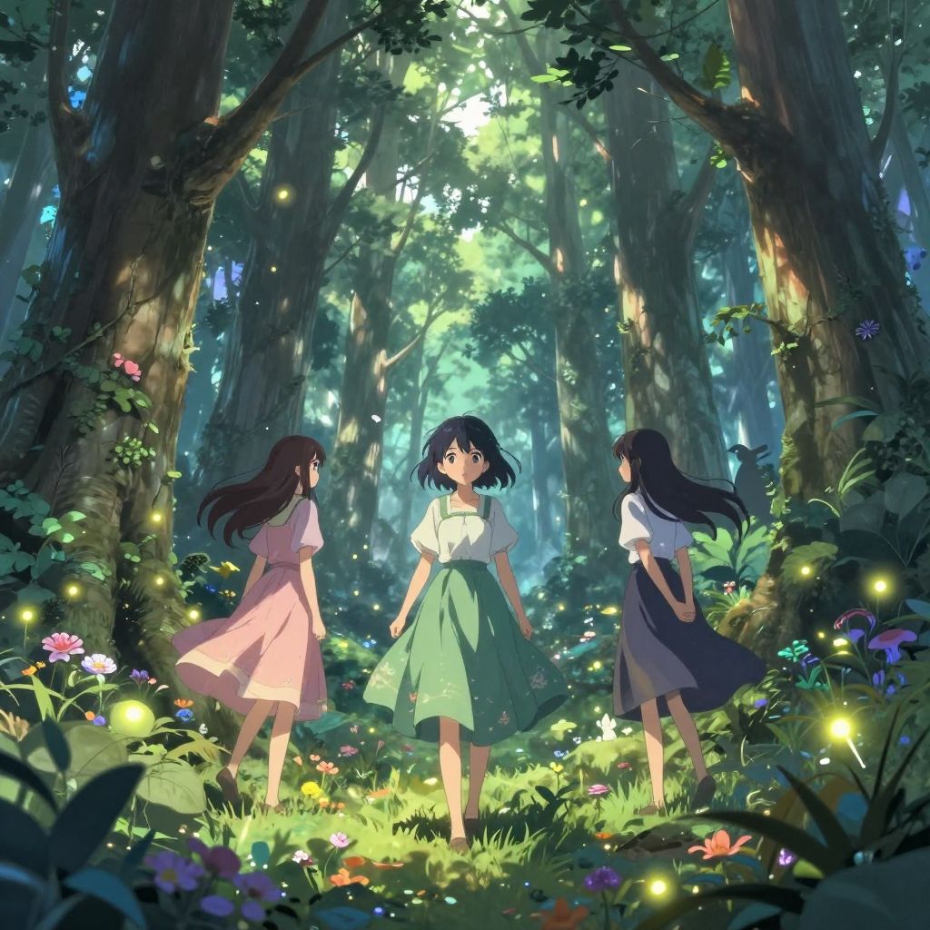 Anime-style illustration of three girls with dark hair in forest, surrounded by glowing fireflies, colorful flowers, and dappled sunlight.