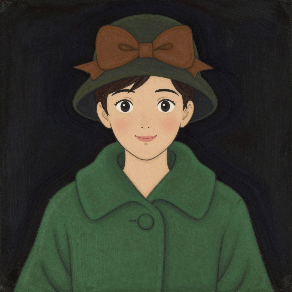 A cartoon-style, anime-inspired young woman with a smile, wearing a green coat and a hat adorned with a brown bow, looking directly at the camera in a symmetrical, dark gouache style reminiscent of Atey Ghailan and Ashley Wood.