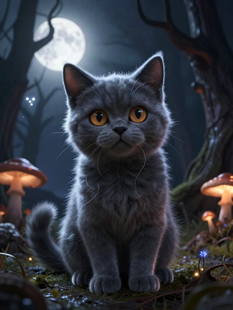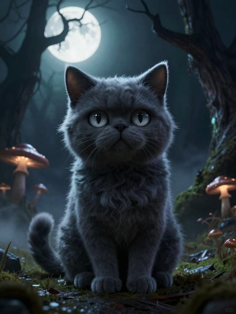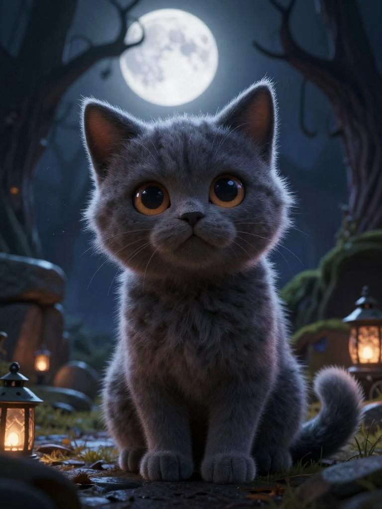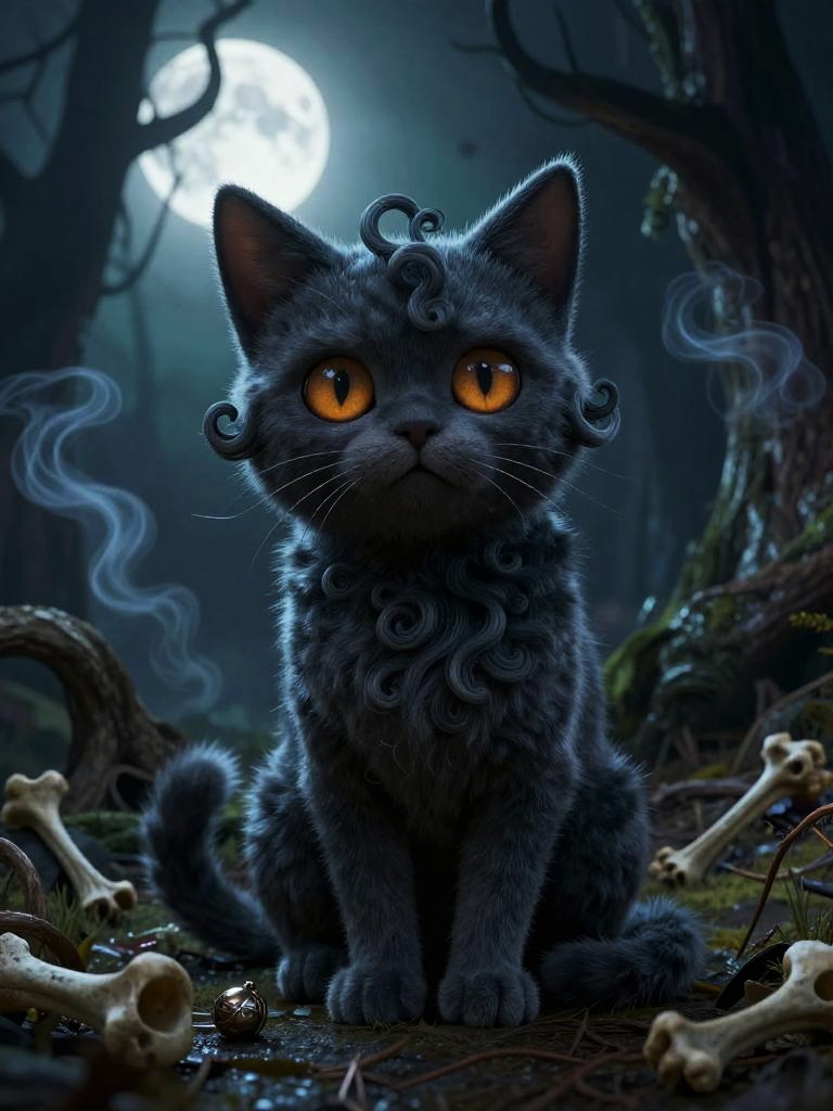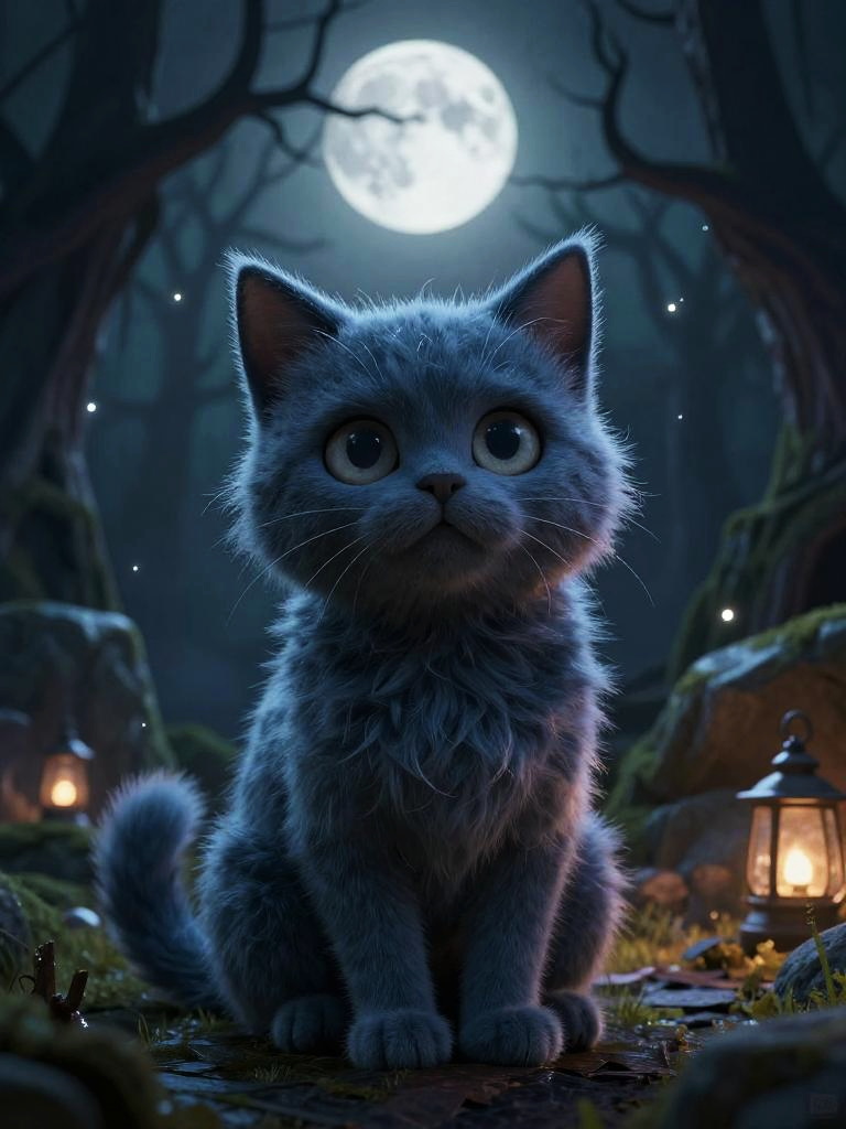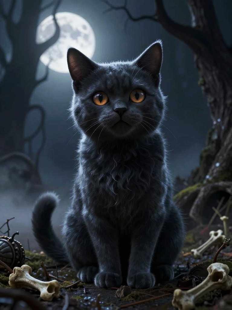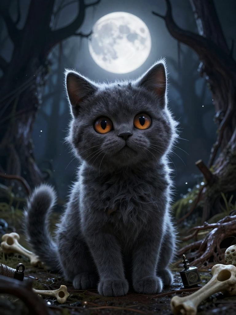 Spooky stylized cat sitting in a twisted haunted forest clearing, small fluffy gray cat with crooked ears, thick matted fur, enormous round soft amber eyes looking slightly worried at the viewer, tail curled beside its paws, surrounded by gnarled roots with scattered bones and trinkets under a glowing full moon, drifting sparkling dust drifting through the air, cinematic close-up with blurred background, highly detailed 3d illustration in dark whimsical fantasy style, cool dim silver backlighting light with subtle highlights on the fur